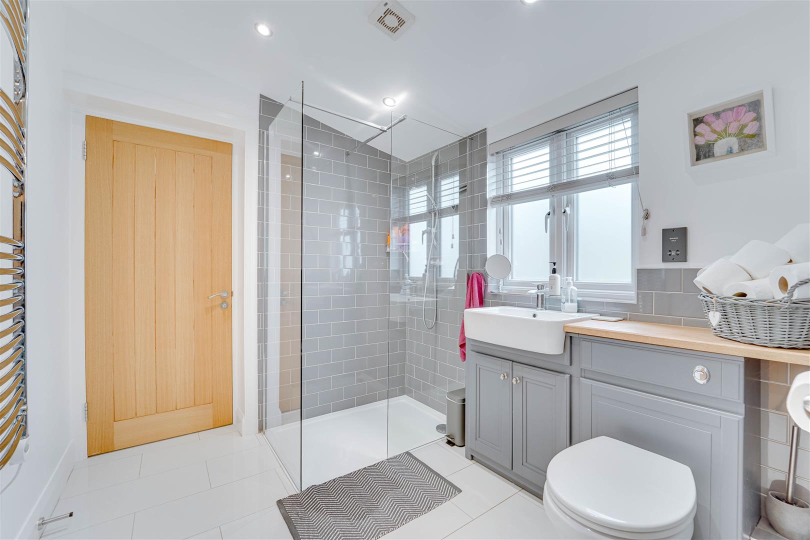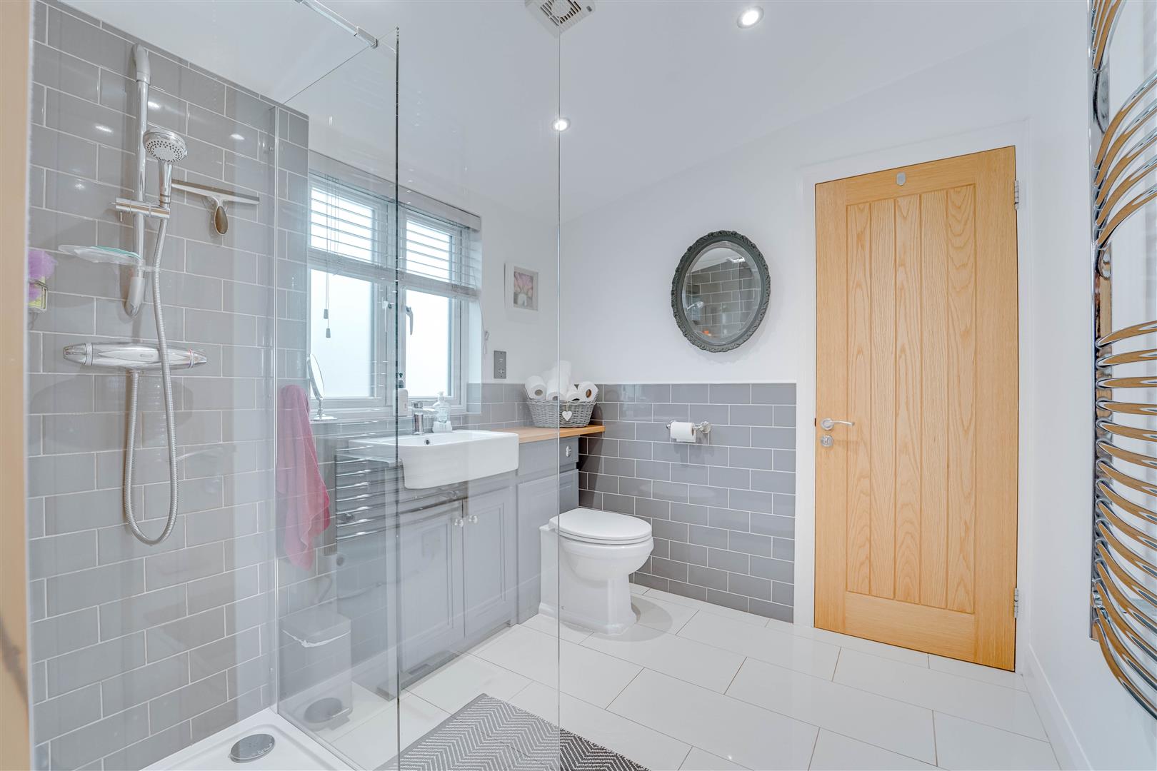 Luxury fitted three piece suite bathroom comprising of a concealed WC, wash basin with vanity under, walk in shower with glass screen, heated towel rail, tiled flooring and window to the rear aspect,