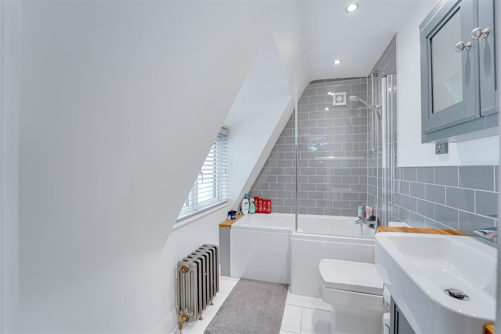 Three piece white suite comprising of a low level WC, wash basin, p-shaped bath with wall mounted shower, part tiled walls, radiator and window to the rear aspect.