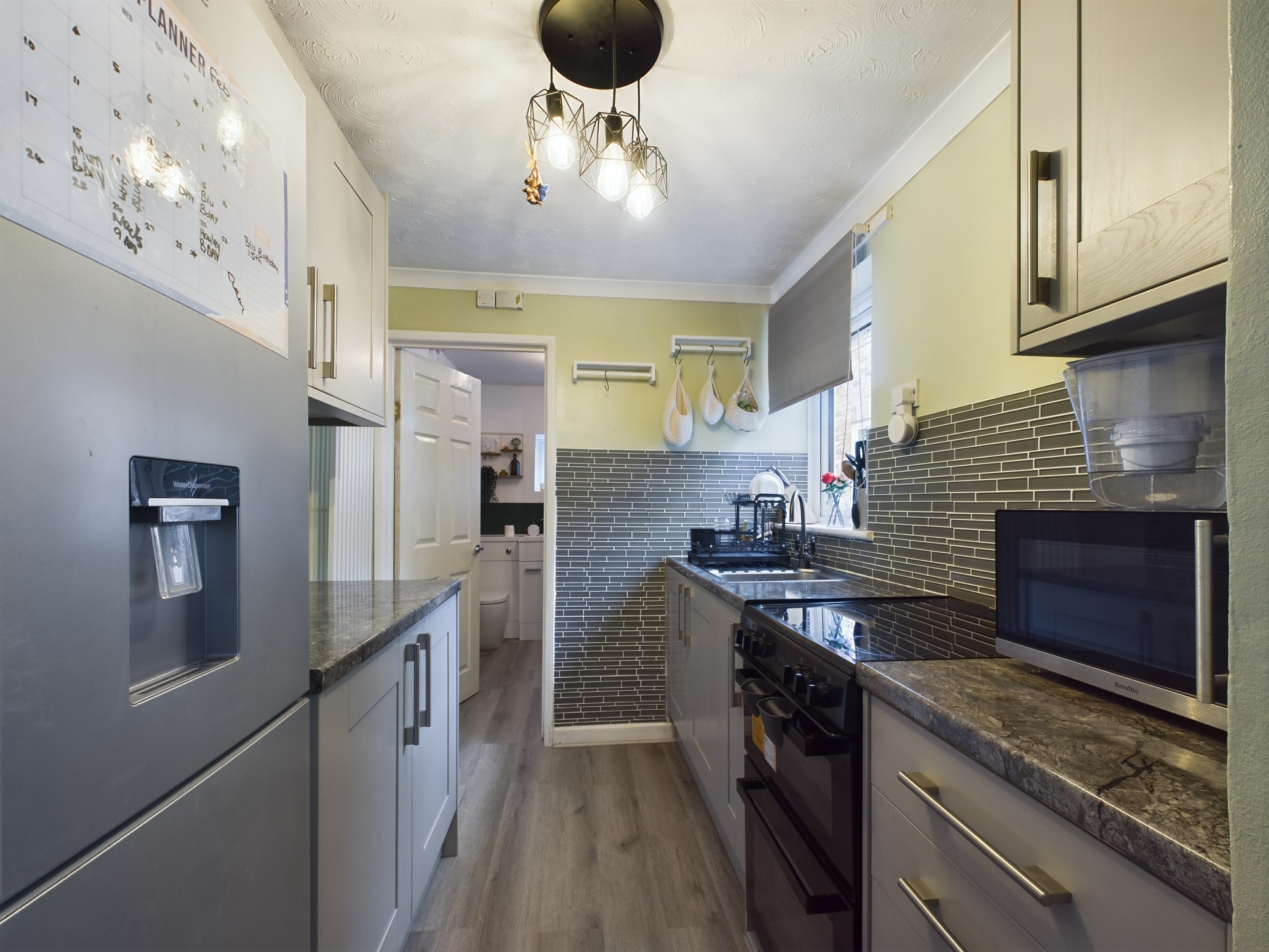 uPVC double glazed window to side, wall mounted upright radiator, wall and base units under round edge worksurfaces, stainless steel sink drainer inset with mixer tap over, space for electric oven and hob, space for fridge/freezer, laminate style flooring, textured and coved ceiling, door to:-