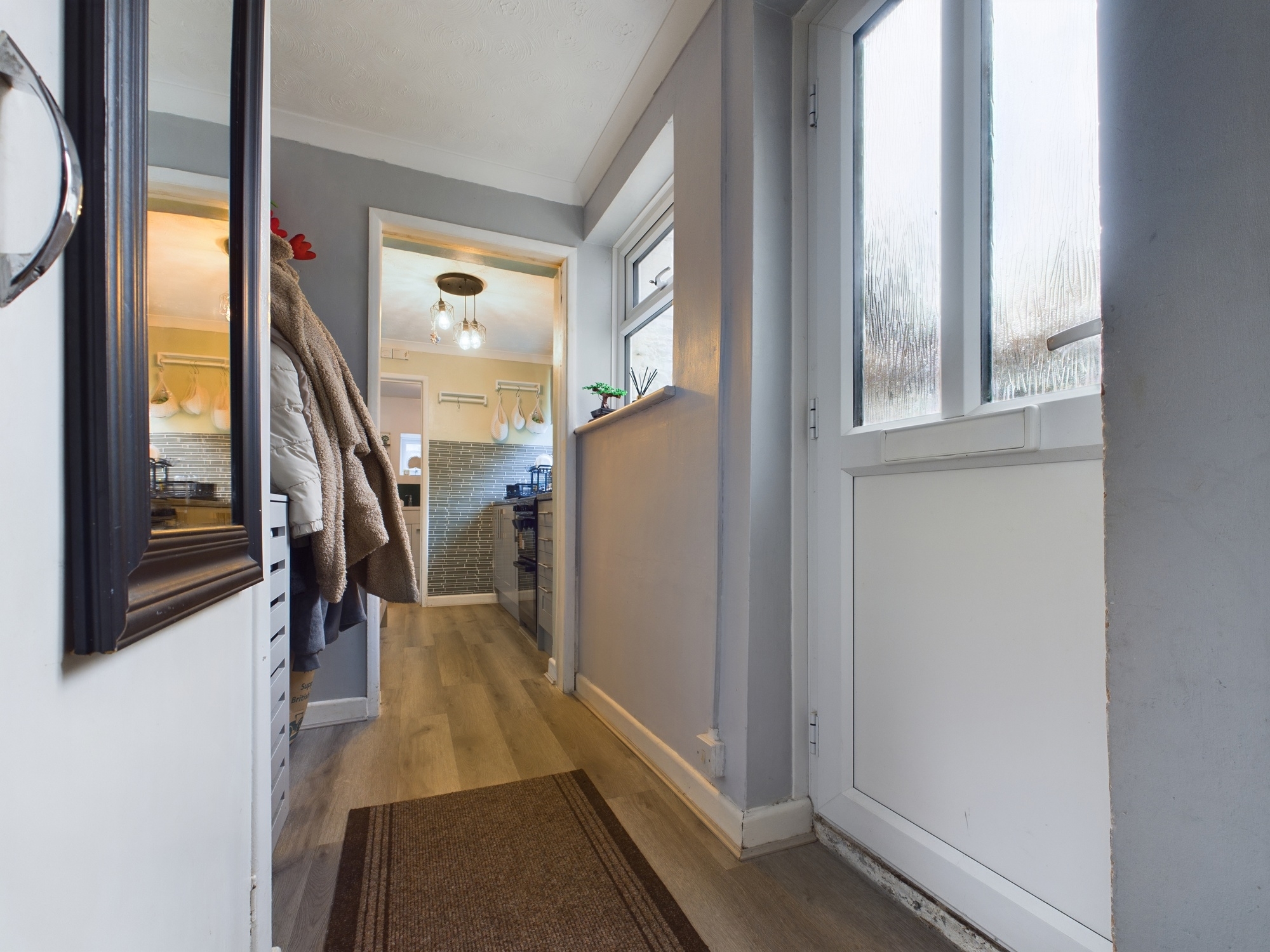 uPVC double glazed door to side, uPVC double glazed window to side, door to airing cupboard housing electric boiler, laminate style flooring, textured and coved ceiling, opening through to:-