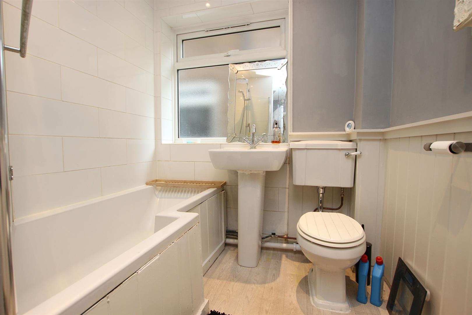 White suite comprising of low level W.C., pedestal hand basin with mixer tap over and panelled bath with wall mounted shower over. Tiled to wet areas. Half height panelling on other walls. Wood effect vinyl flooring. Obscured window.