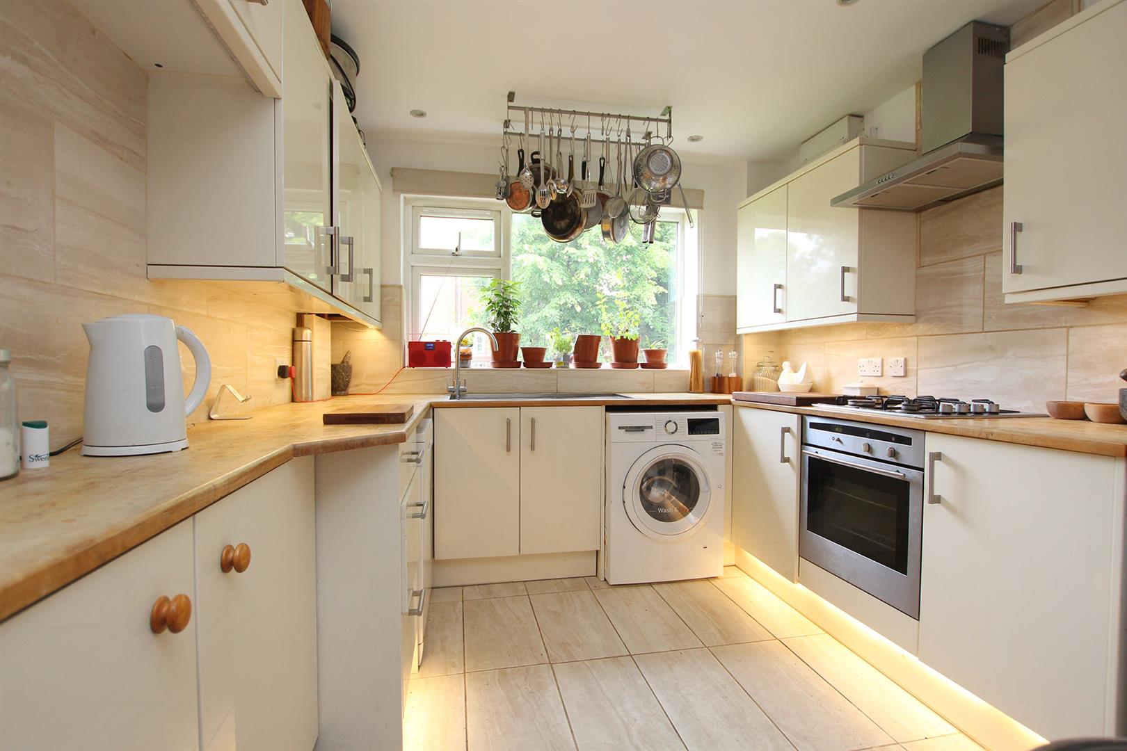 A range of modern eye and base level cupboards with work top over. Under cupboard and plinth lighting. Integrated base level oven and gas hob with stainless steel extractor over. Space and plumbing for washing machine. Space for fridge/freezer. Space and plumbing for dishwasher. Attractively tiled splashbacks throughout and tiled flooring. Window overlooking the front aspect.