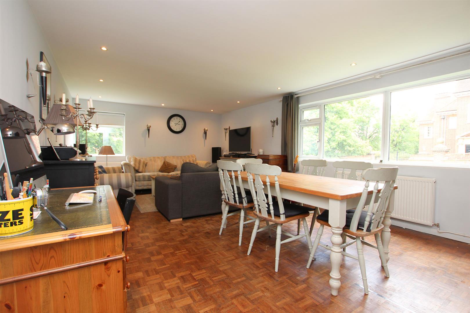 Spacious, light room with dual aspect windows overlooking both the front and side communal gardens. Wooden parquet flooring. Radiators. Down spotlights and wall lights.