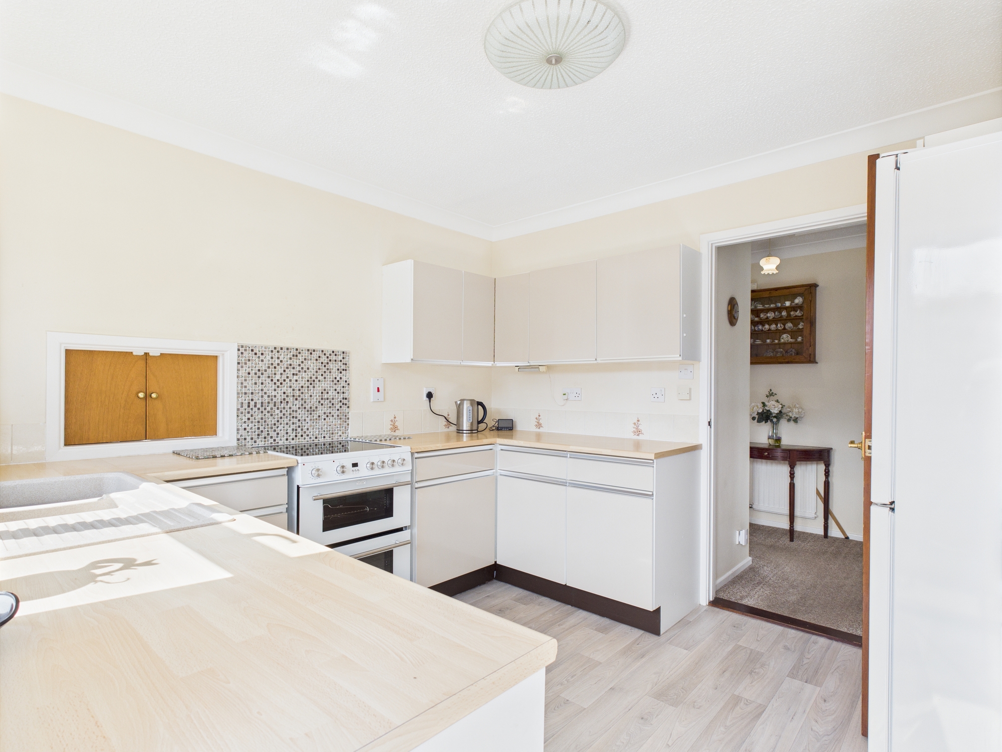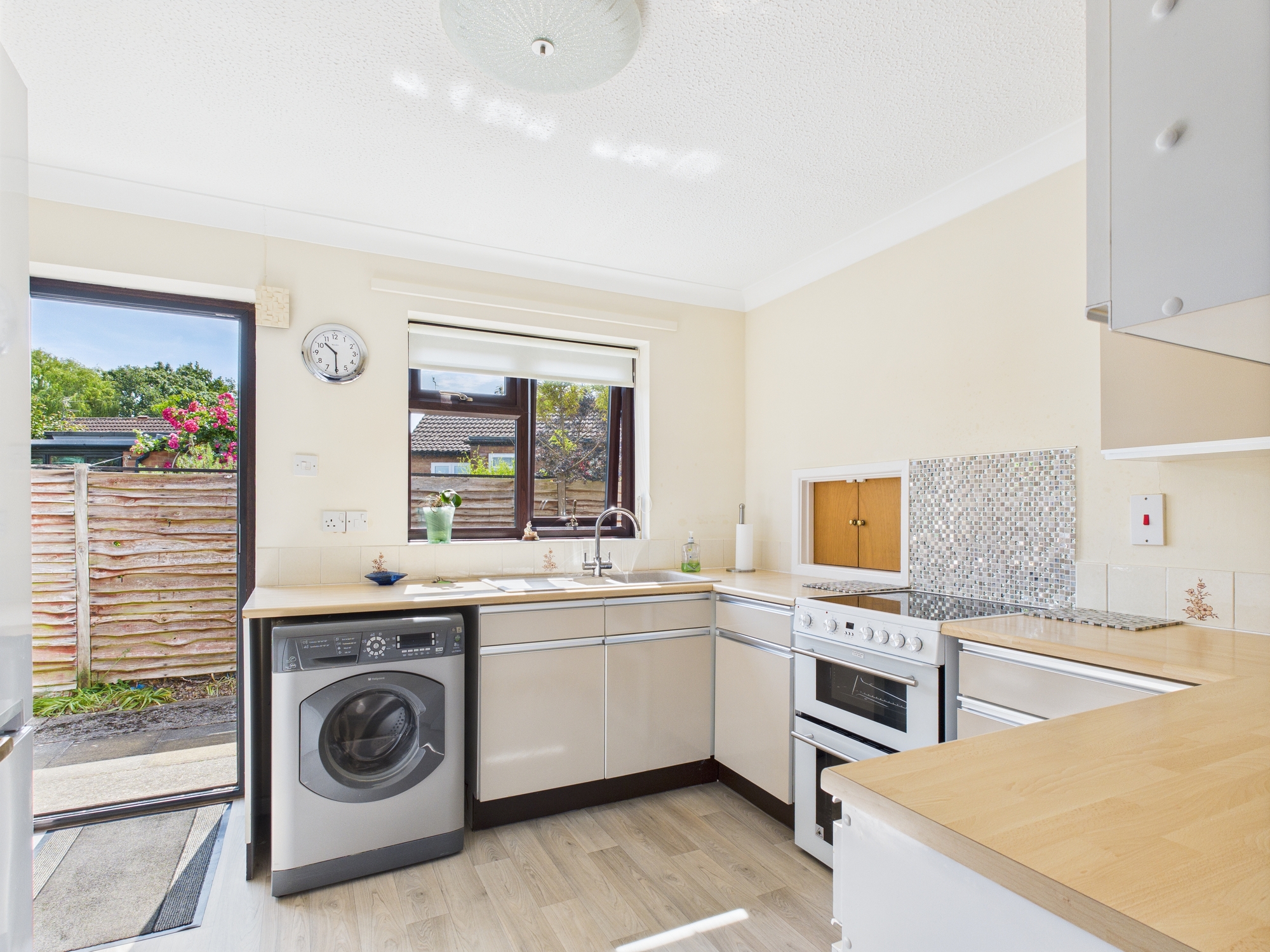 uPVC double glazed window and door to side, wall mounted single panel radiator, wall and base units under round edge worksurfaces, 1 1/2 sink drainer inset with mixer tap over, space for oven/hob, space for washing machine, space for fridge/freezer, lino style flooring, textured and coved ceiling, serving hatch.