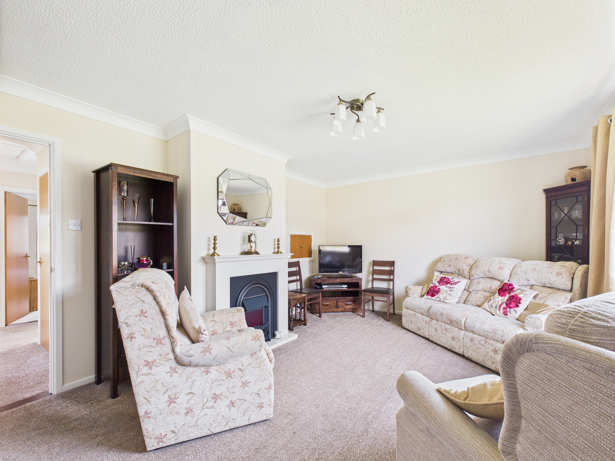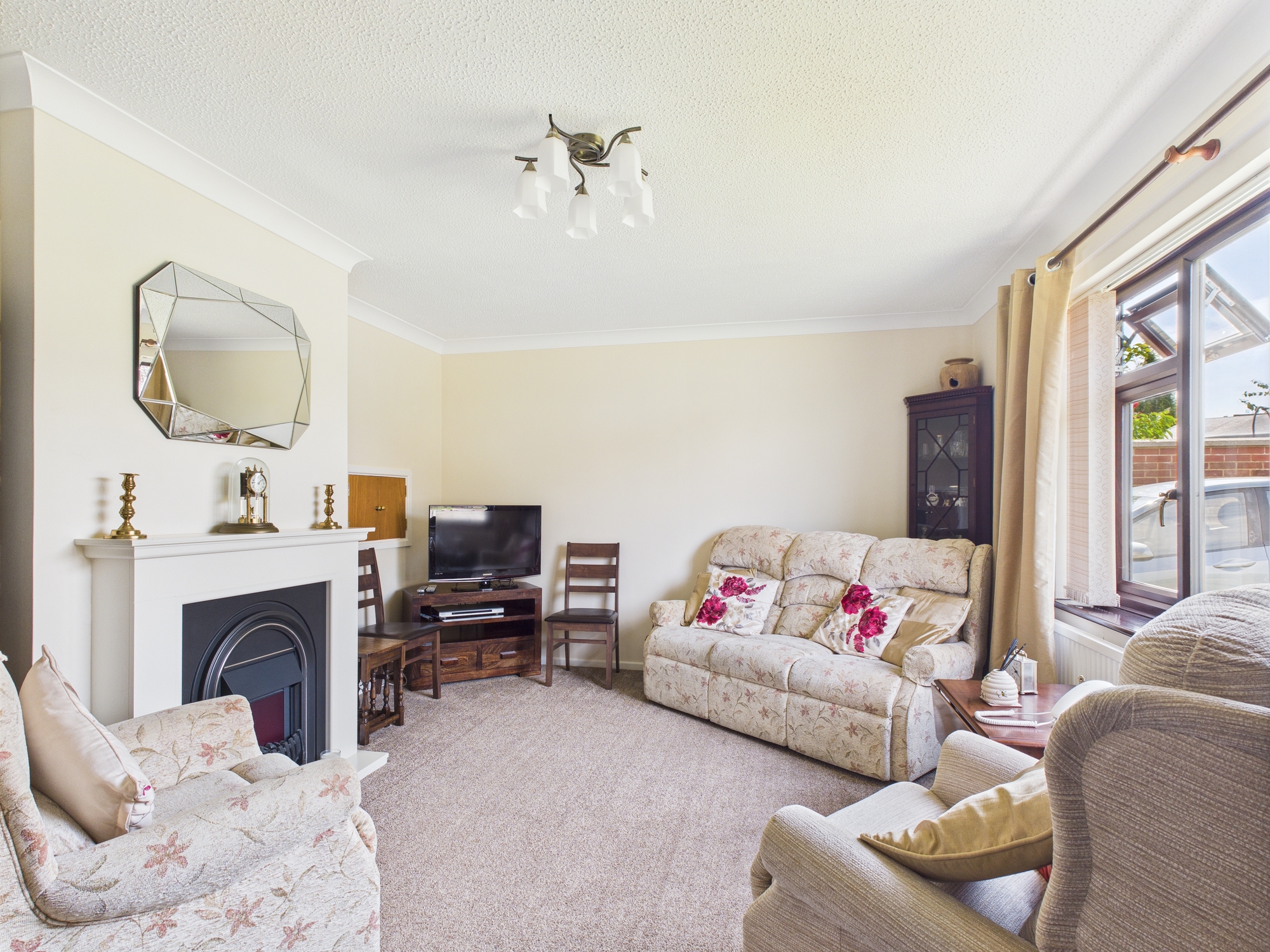 uPVC double glazed window to front, wall mounted single panel radiator, central fireplace with electric fire inset, textured and coved ceiling.