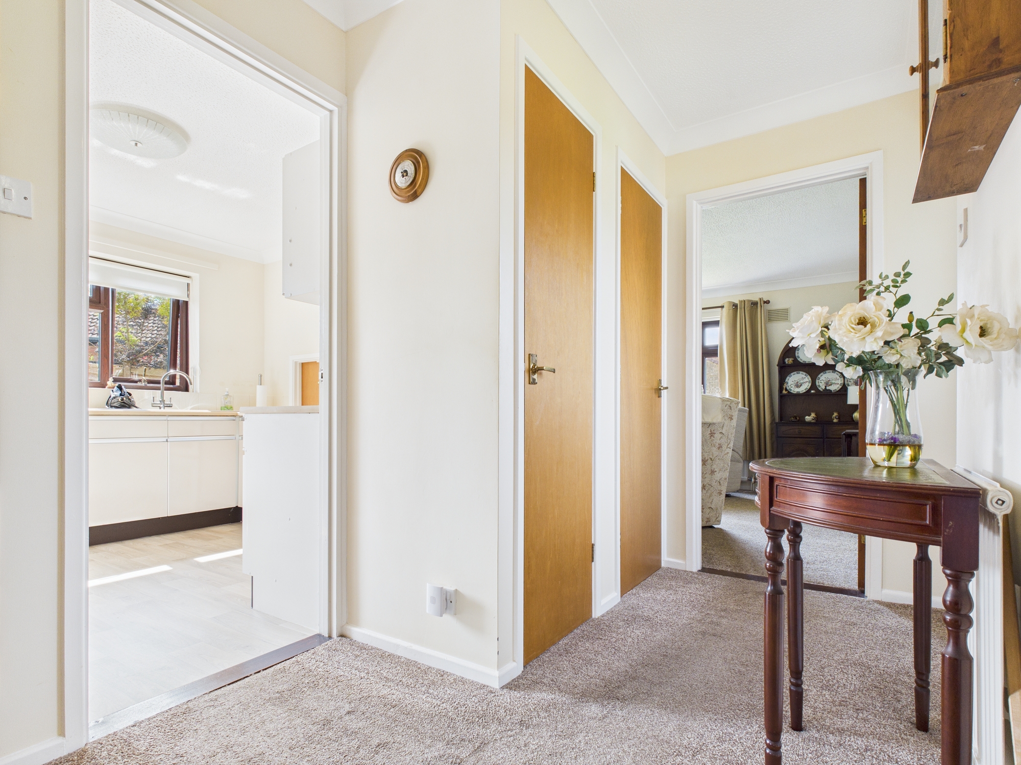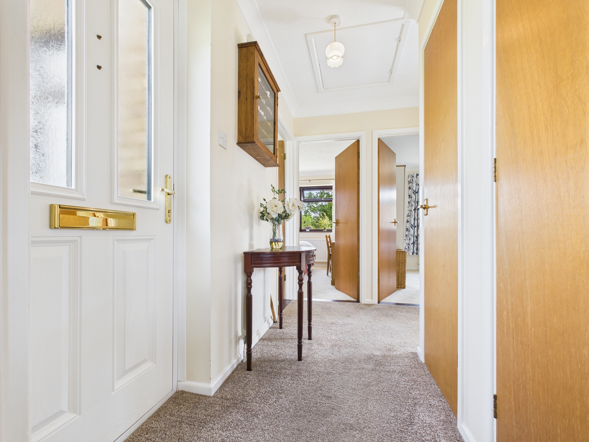 Wall mounted single panel radiator, door to airing cupboard housing gas central heating boiler and shelving, door to storage cupboard, loft access, textured and coved ceiling, doors to all rooms.