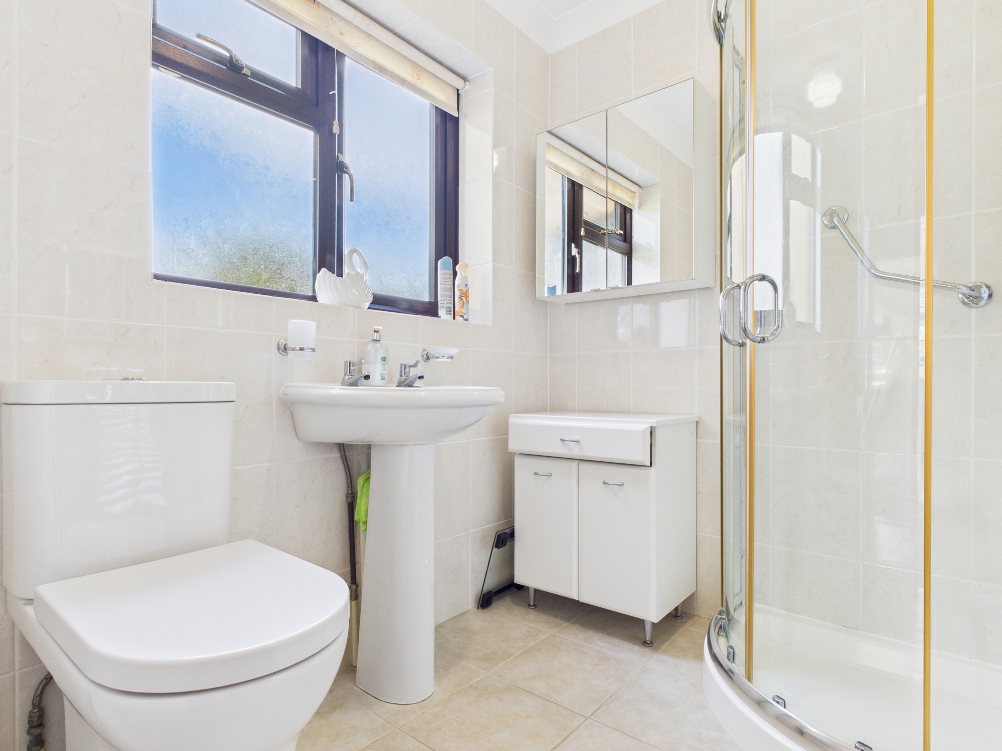 uPVC double glazed window to front, wall mounted heated towel rail, corner shower cubicle, w.c., pedestal handwash basin, fully tiled walls and flooring, textured and coved ceiling, wall mounted mirrored storage cupboard.