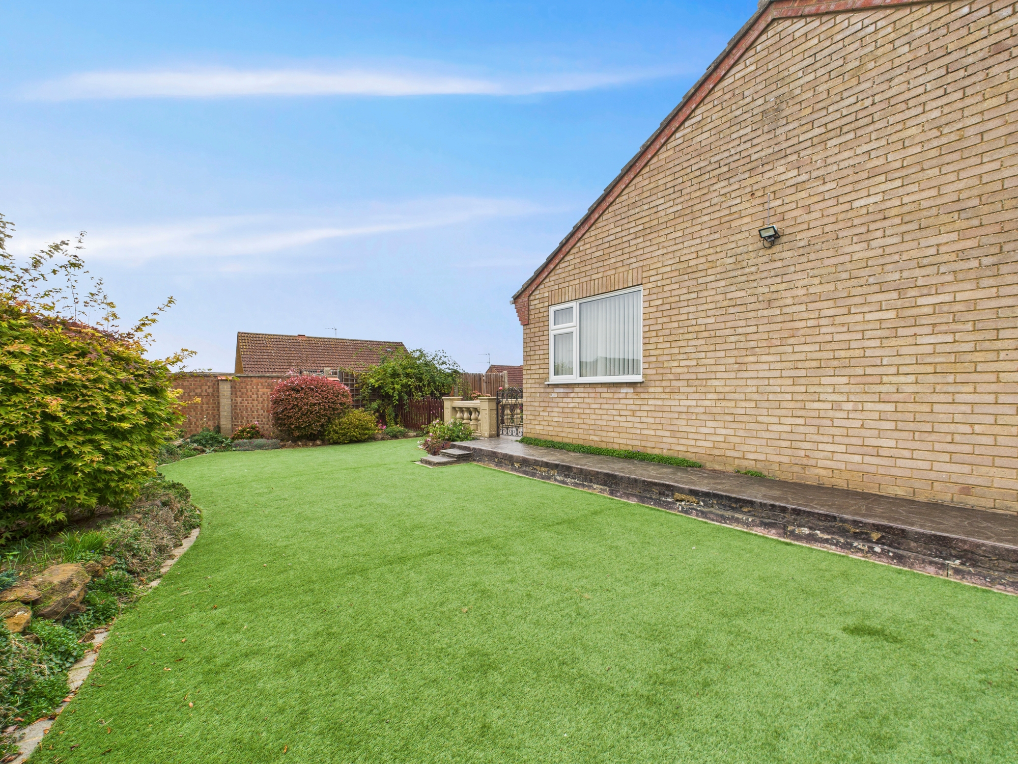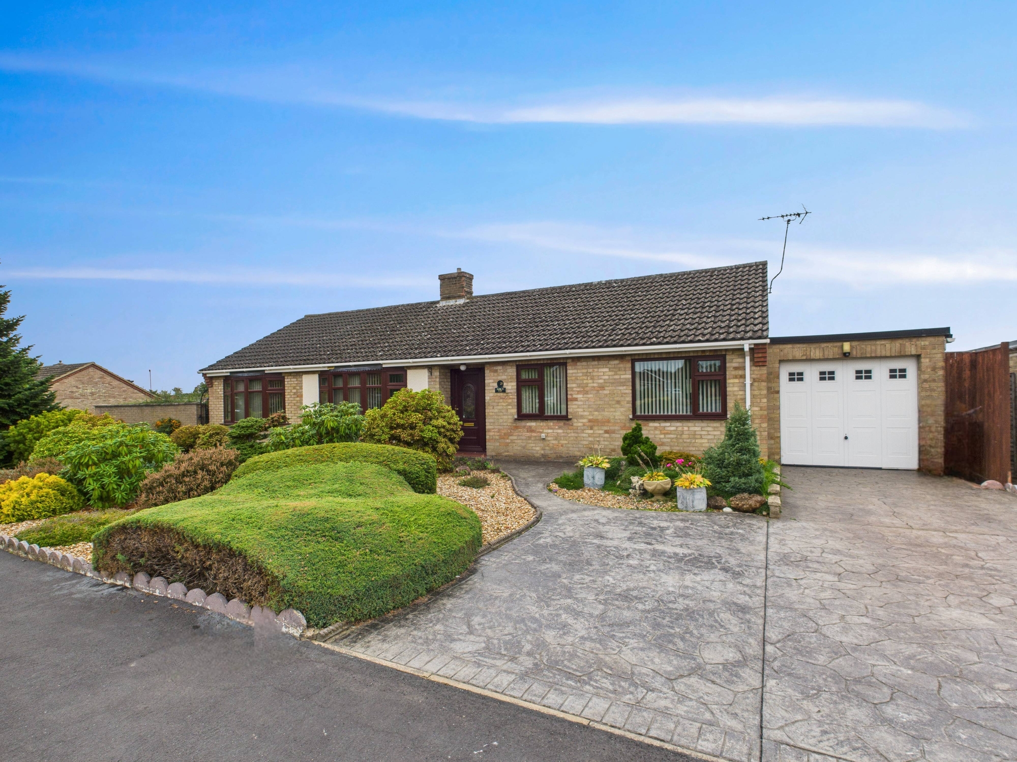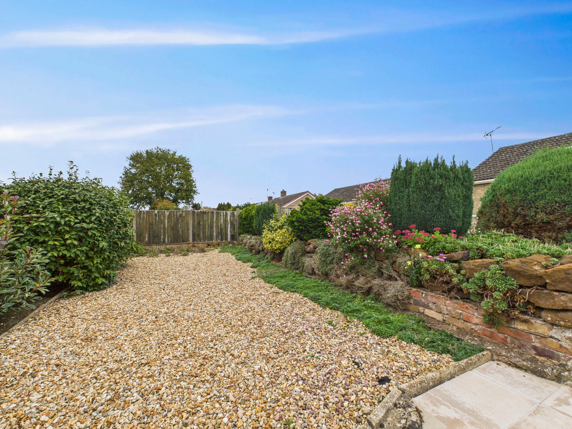 To the front of the property there is a driveway leading to the garage with electric door. The front garden is mainly laid to gravel with mature shrubs and trees. There is a gate to the side leading to the side garden with brick wall boundary, artificial turf and mature shrub border. The rear garden is mainly laid to gravel with mature shrubs and flowers along with patio areas.