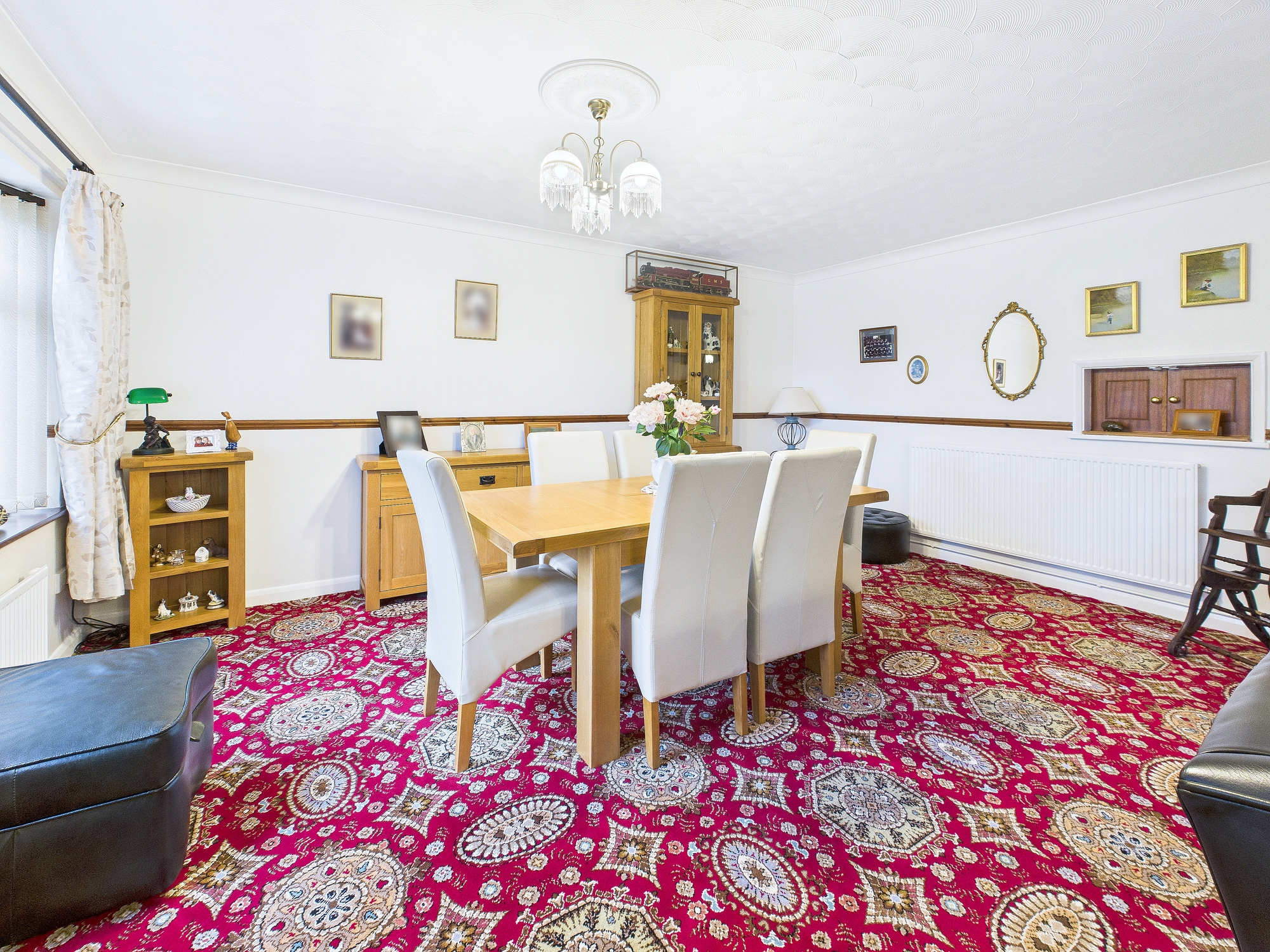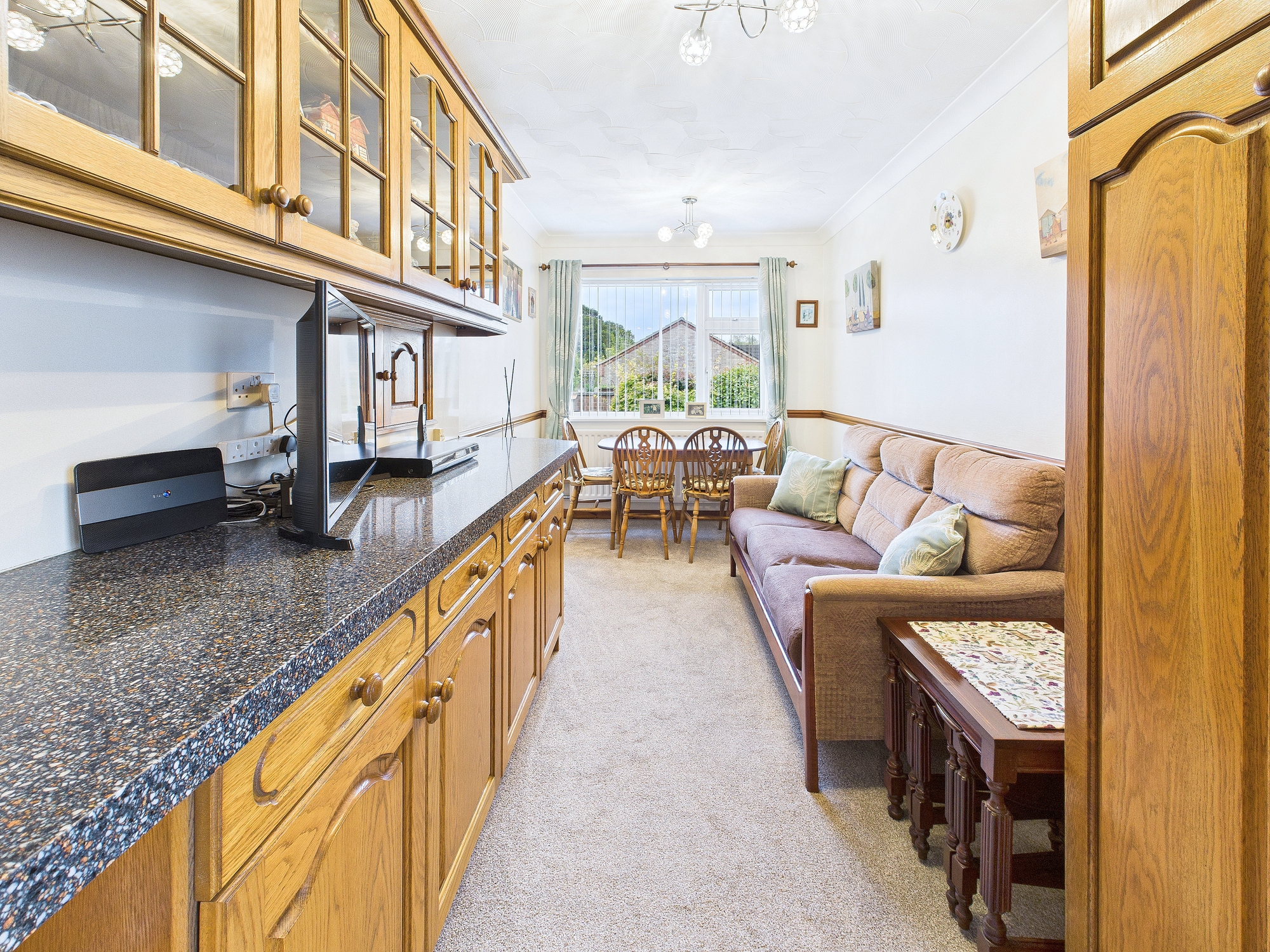 2 x uPVC double glazed bow window to front, 3 x wall mounted radiator, gas fire set into fireplace with stone hearth and wooden surround, serving hatch.