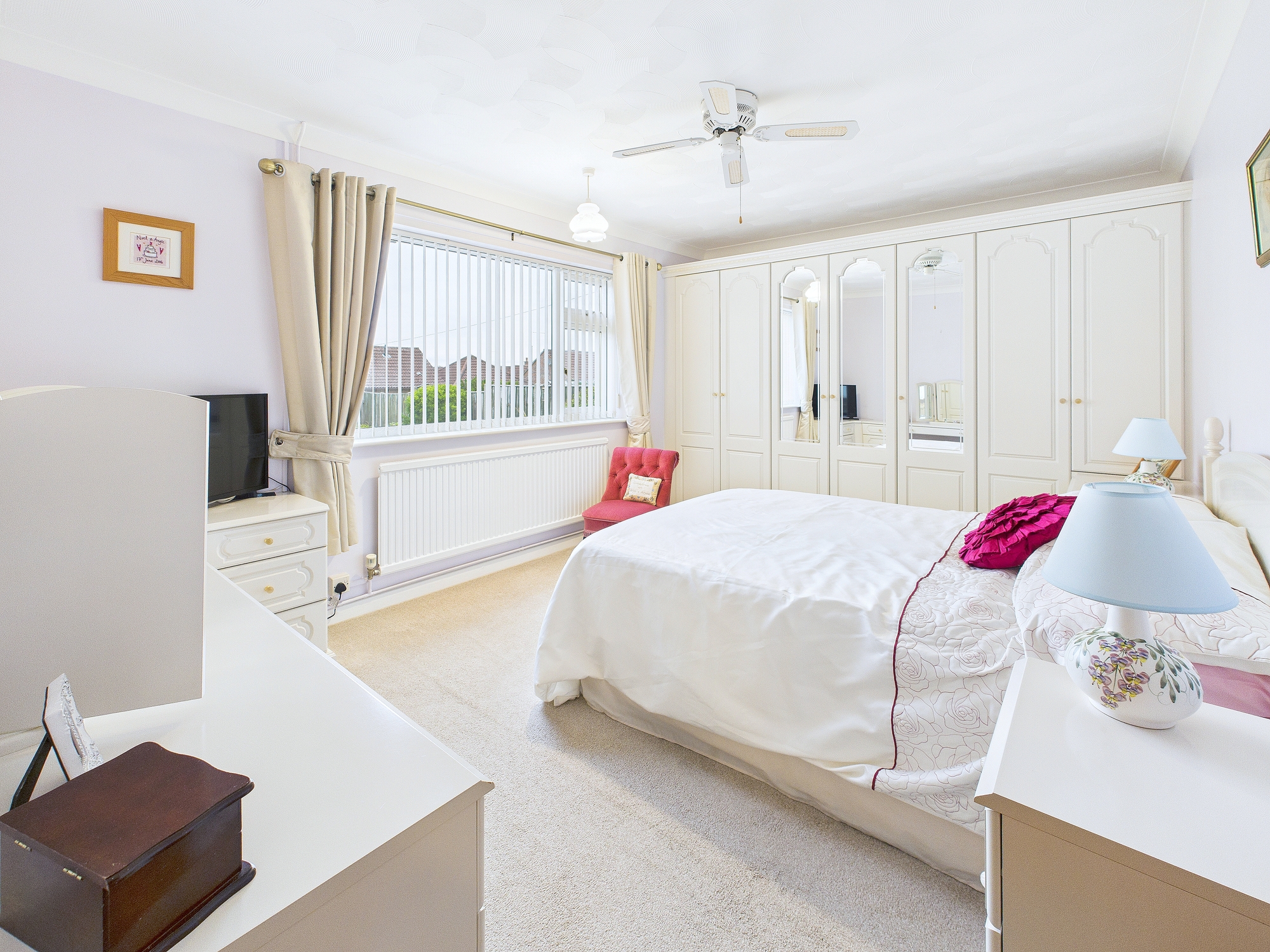 Fitted wardrobes, dressing table and drawer units, uPVC double glazed window to rear, wall mounted radiator.