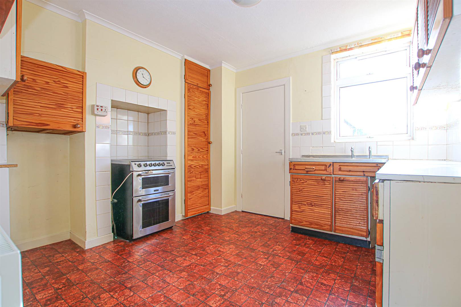 With a range of eye and base level cupboards with work top over. Stainless steel sink and drainer. Space and plumbing for washing machine. Inset space and connection for electric cooker. Built-in pantry cupboard. Radiator. Opening to inner hallway. Glazed door to the living room. Door to the hallway. Window to the rear aspect.