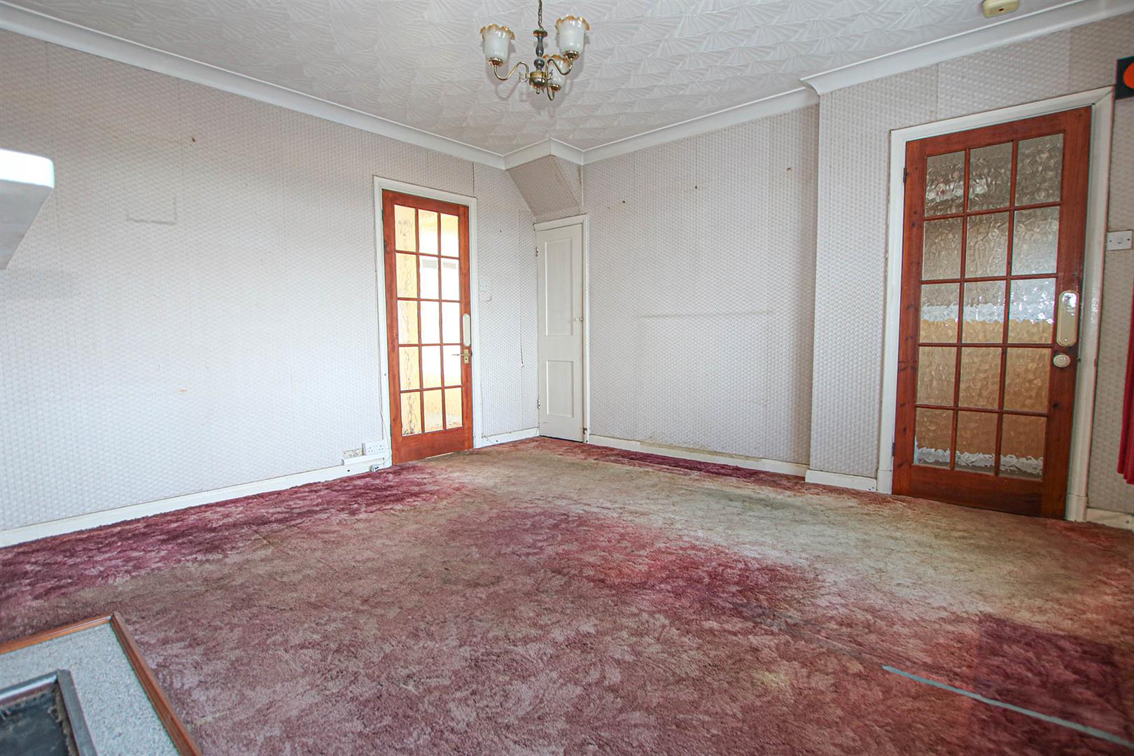 Spacious living room with feature fireplace with attractive white surround and mantel (NB: not currently in use). Arched alcoves either side. Dual windows to the front aspect. Radiator. Built-in storage cupboard. Glazed doors to the kitchen and the entrance hall.