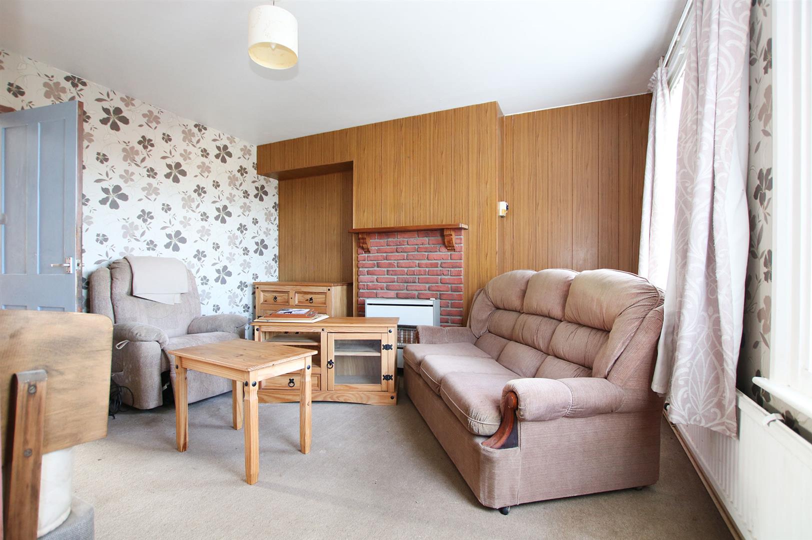 Spacious living room with dual windows to the front aspect. Fireplace with exposed brick surround and wooden mantel currently fitted with an electric fire. Radiator. Doors leading to the kitchen and entrance hall.