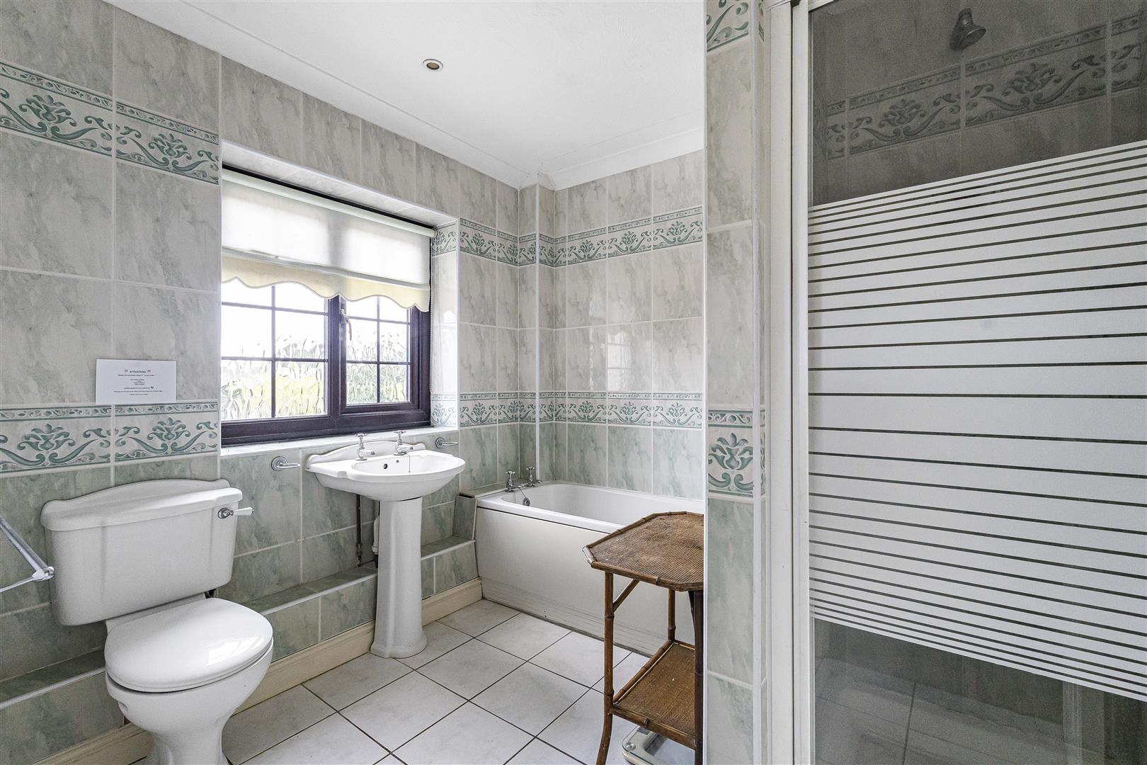 White suite comprising low level W.C., pedestal hand basin, panelled bath and walk-in shower with wall mounted shower. Attractively tiled throughout. Tiled flooring. Radiator. Obscured window. Door to Master bedroom