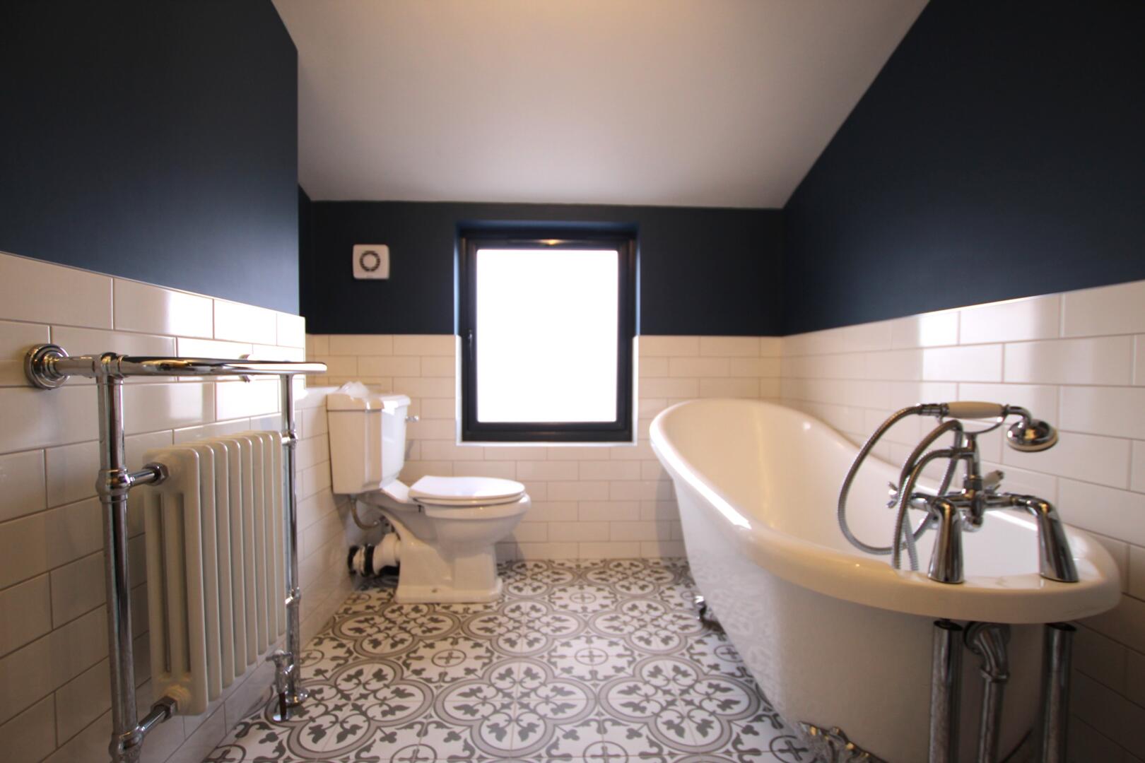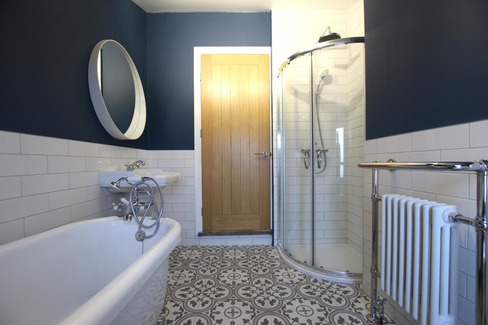 Upstairs, the first floor provides a generous master bedroom, a single bedroom and a large family bathroom featuring both a bathtub and separate shower. A further single bedroom is located on the second floor.