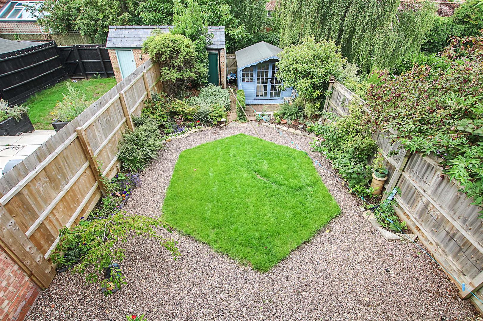 Fully enclosed with mature shrubberies. Patio area for seating. Summer house and outbuilding.