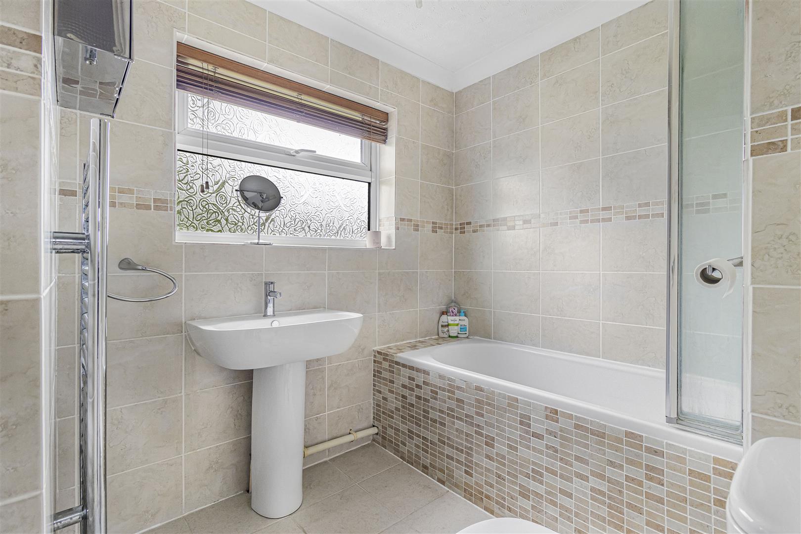 Modern white suite comprising low level W.C., pedestal hand basin with mixer tap over and bath with mixer tap and wall mounted shower over. Attractively tiled throughout. Ladder radiator. Obscured window. Door to landing.
