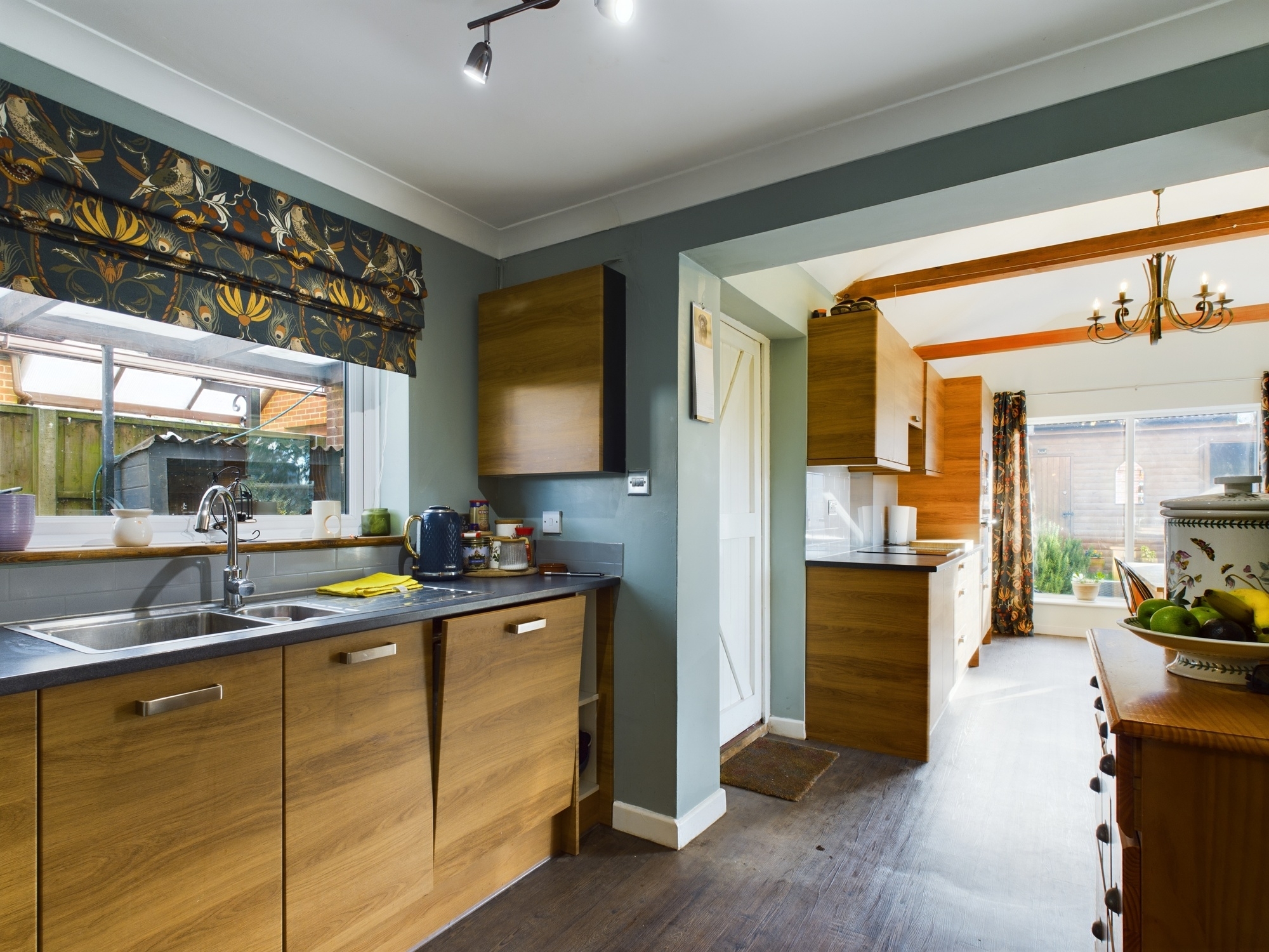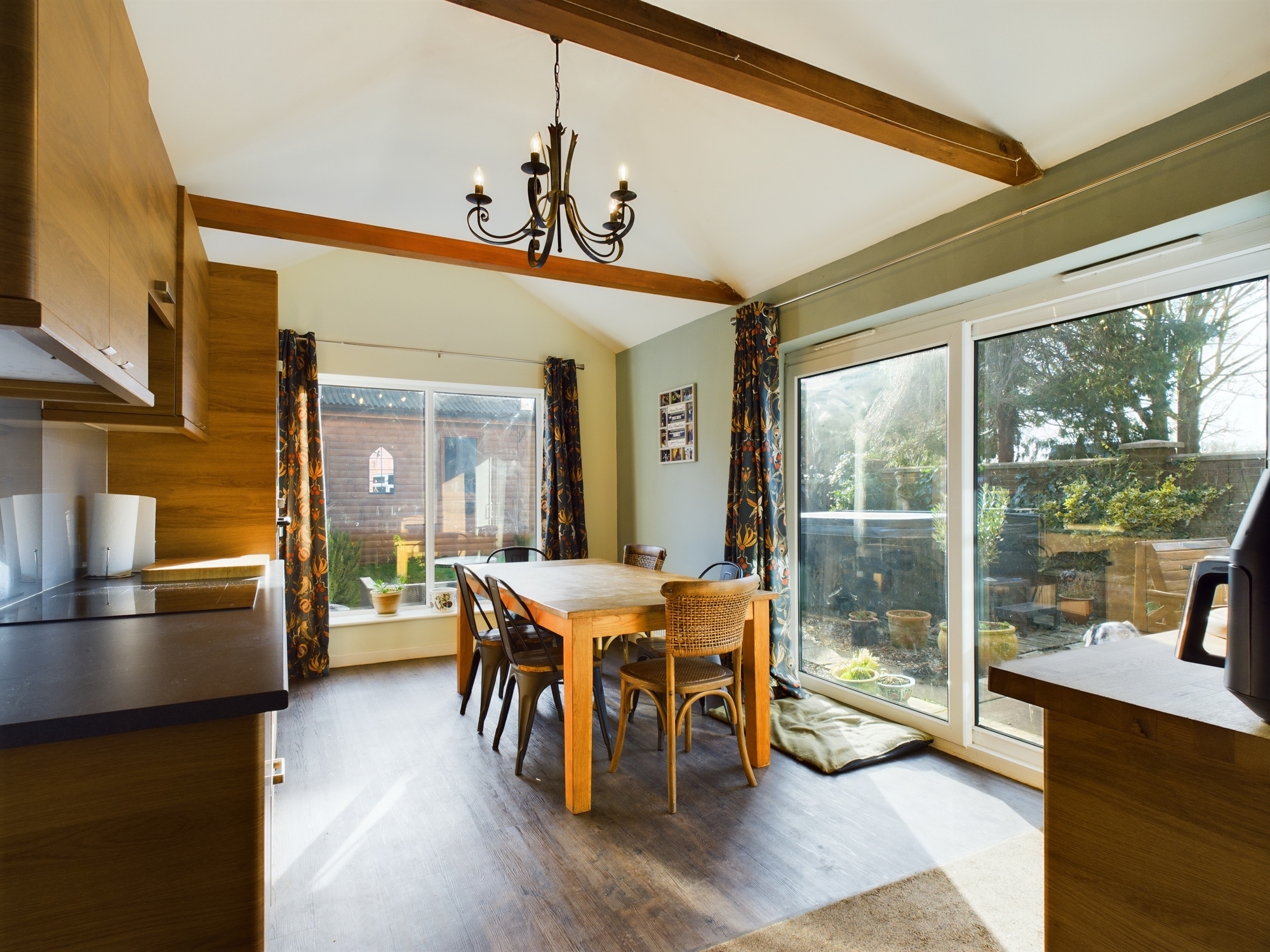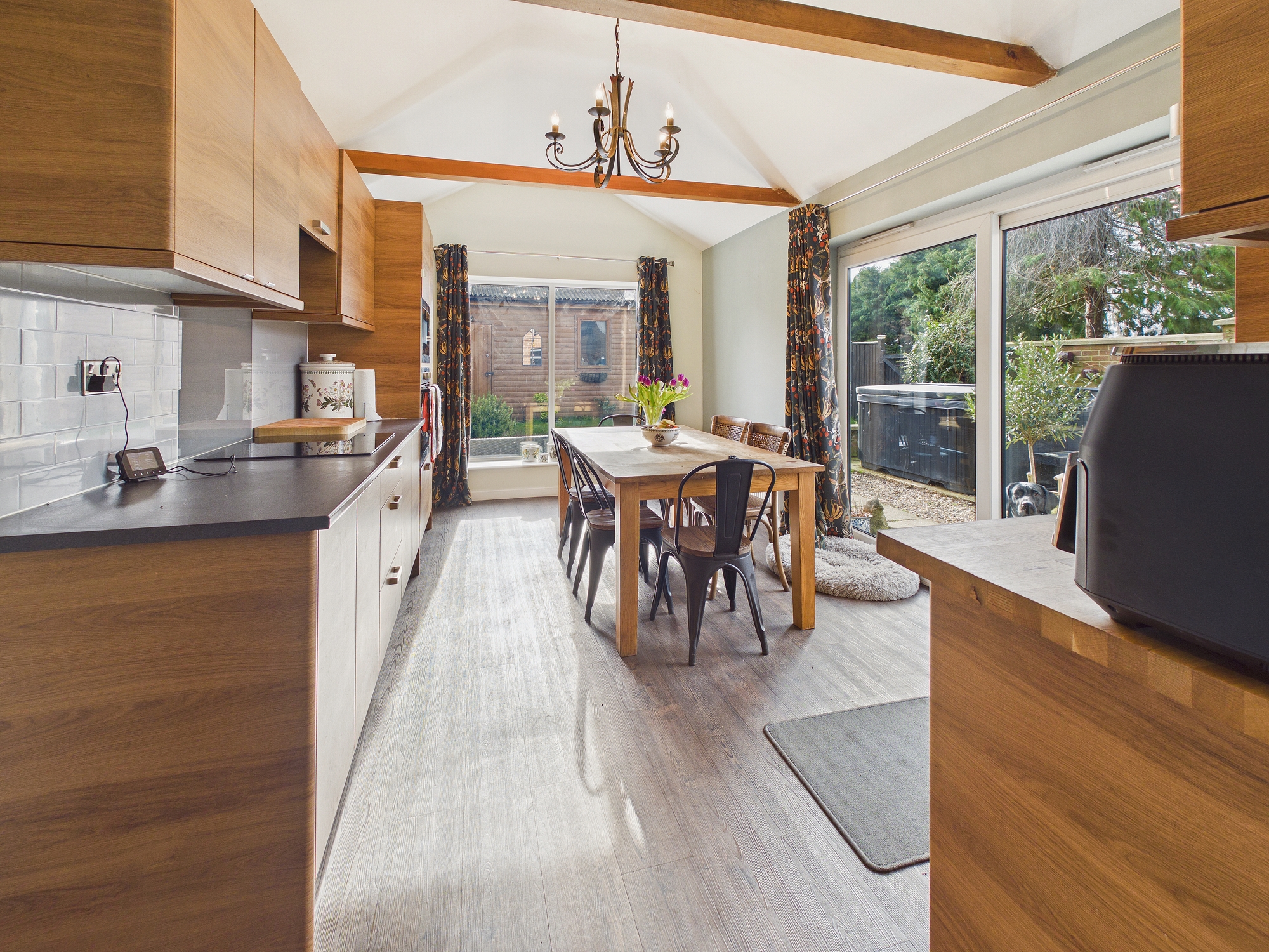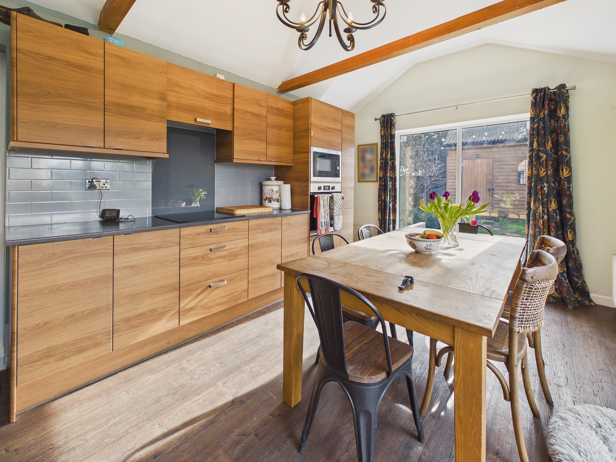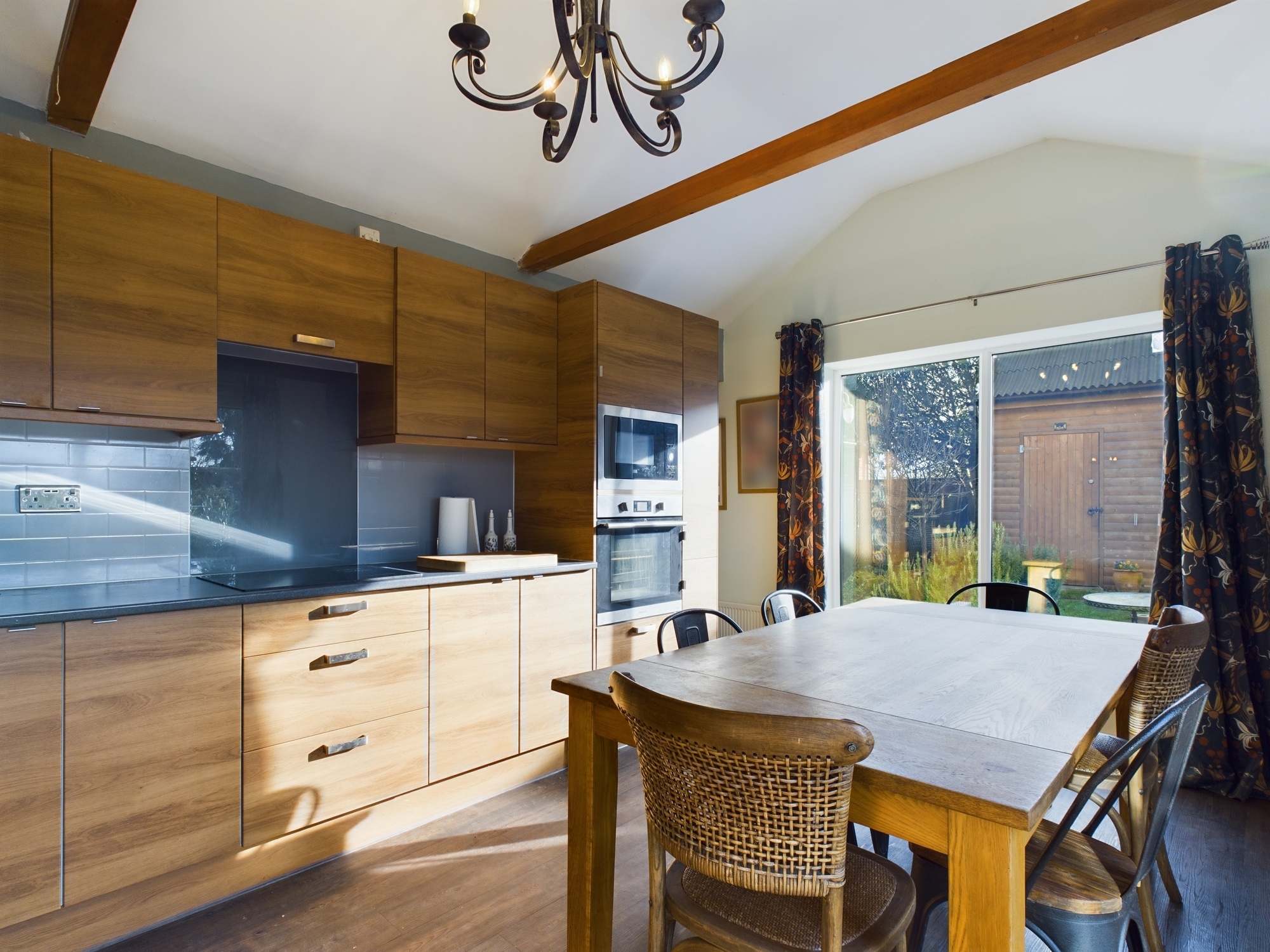 uPVC double glazed window to side and uPVC double glazed window to rear, wall mounted single panel radiator, uPVC double glazed sliding doors to rear, 1 1/2 stainless steel sink drainer with mixer tap over, 4 ring hob inset to worksurface with extractor over, integral microwave, integral fridge/freezer, integral dishwasher, LVT, vaulted beamed ceiling, door to front driveway and carport, integral door to garage.
