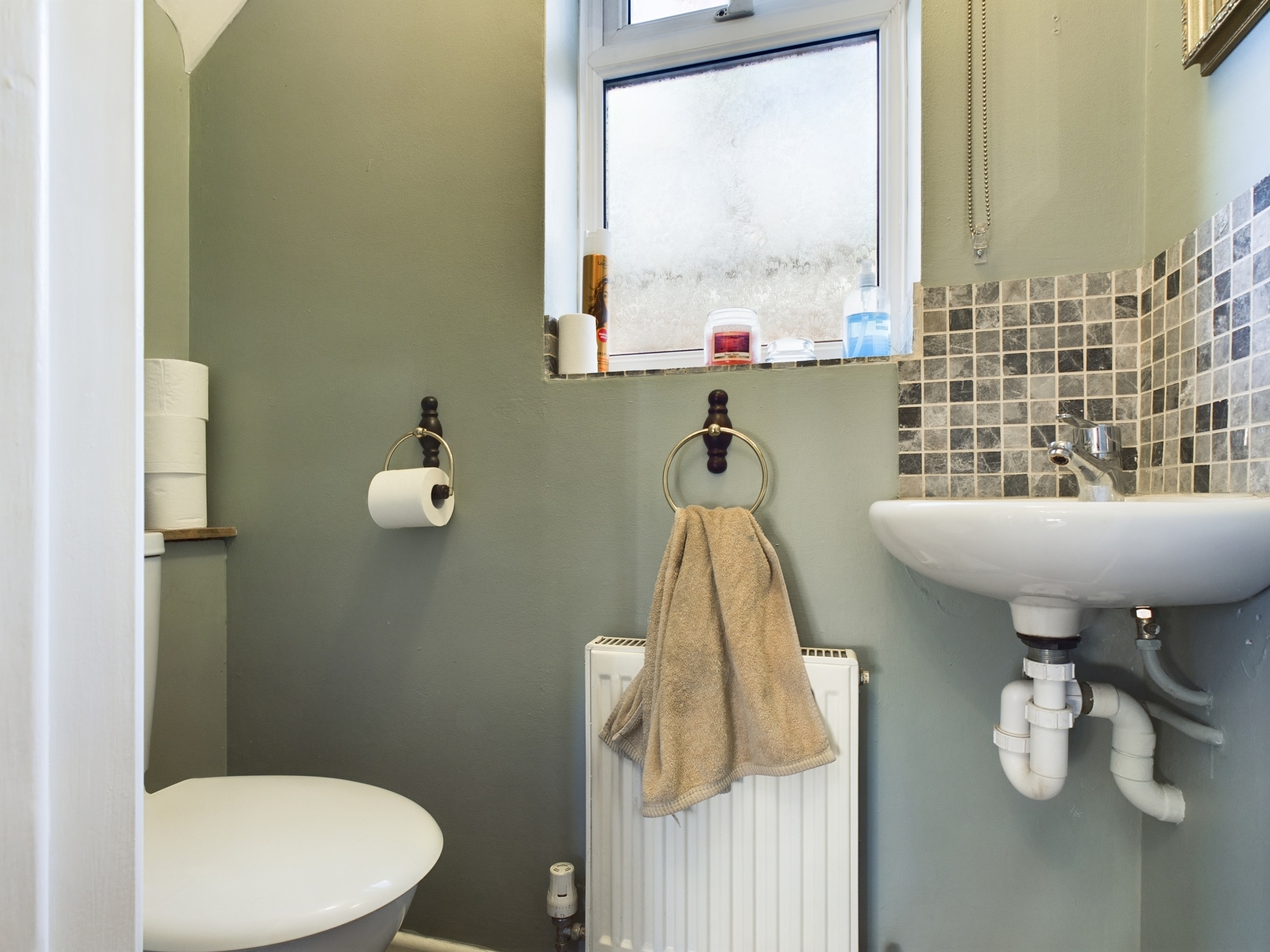 uPVC double glazed window to side, wall mounted single panel radiator, w.c., corner handwash basin, LVT, textured and coved ceiling. uPVC double glazed window to side, wall mounted single panel radiator, w.c., corner handwash basin, LVT, textured and coved ceiling.