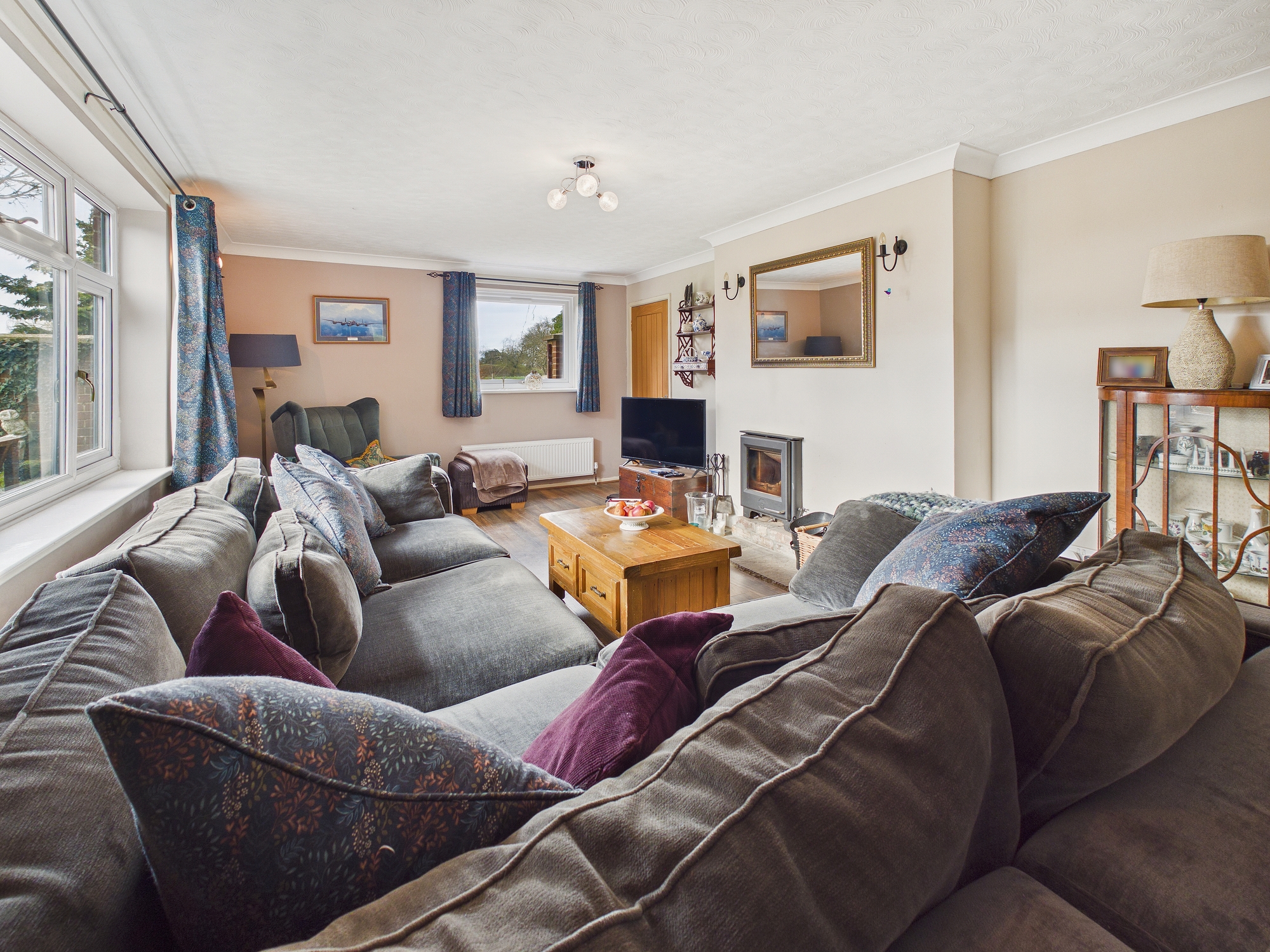 uPVC double glazed window to rear and side, 2 x wall mounted double panel radiators, laminate style flooring, multi fuel burner inset to chimney breast with tiled hearth, textured and coved ceiling, door to:-
