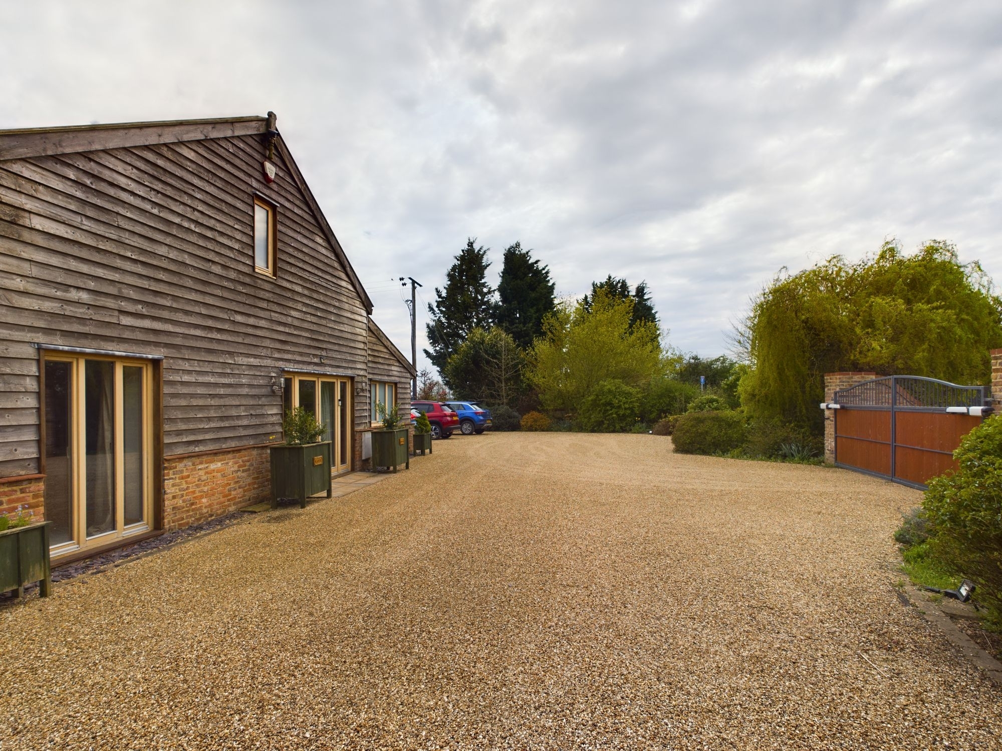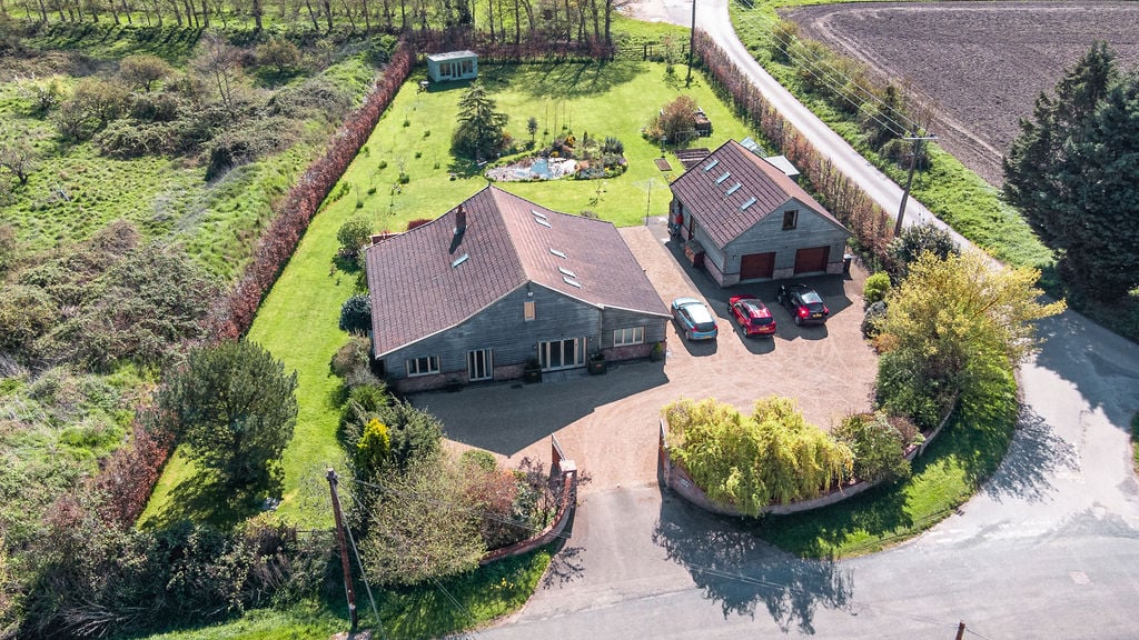 Discover a truly unique opportunity — a wonderfully presented and individually designed barn conversion, set on approximately three-quarters of an acre (subject to measured survey) on the edge of a sought-after village. This home combines modern luxury with rustic charm, offering the perfect blend of space, character, and contemporary convenience. Step inside through a spacious and welcoming entrance hall, where the oak staircase immediately sets the tone for the quality throughout. The heart of the home is a stunning kitchen/breakfast room with AEG integrated appliances and granite worktops, seamlessly opening to the dining room. From here, solid oak doors lead into a generous lounge featuring an Inglenook fireplace with log burner, and French doors opening onto the gardens. The ground floor also offers a luxurious master bedroom suite with walk-in wardrobe and en-suite, two further bedrooms, and a family bathroom. Upstairs, two additional bedrooms both enjoy walk-in wardrobes and views across the grounds. Modern living is enhanced with underfloor heating, Fujitsu air-source and electric systems, triple glazing, and a Sonos sound system throughout. Outside, the detached triple-width garage is more than just storage — it includes a utility/kitchenette, shower room, and two versatile rooms above, ideal for guests, an office, or hobbies. The landscaped gardens are a delight, featuring a pond, fruit trees, and colourful planting, while the extensive shingle driveway ensures plentiful parking, all accessed via electric gates. Located just 7 miles from Downham Market with excellent amenities and rail links to Cambridge and London Kings Cross, this is a home that truly has it all. Internal viewing is essential to fully appreciate the quality, space, and lifestyle this remarkable property offers.