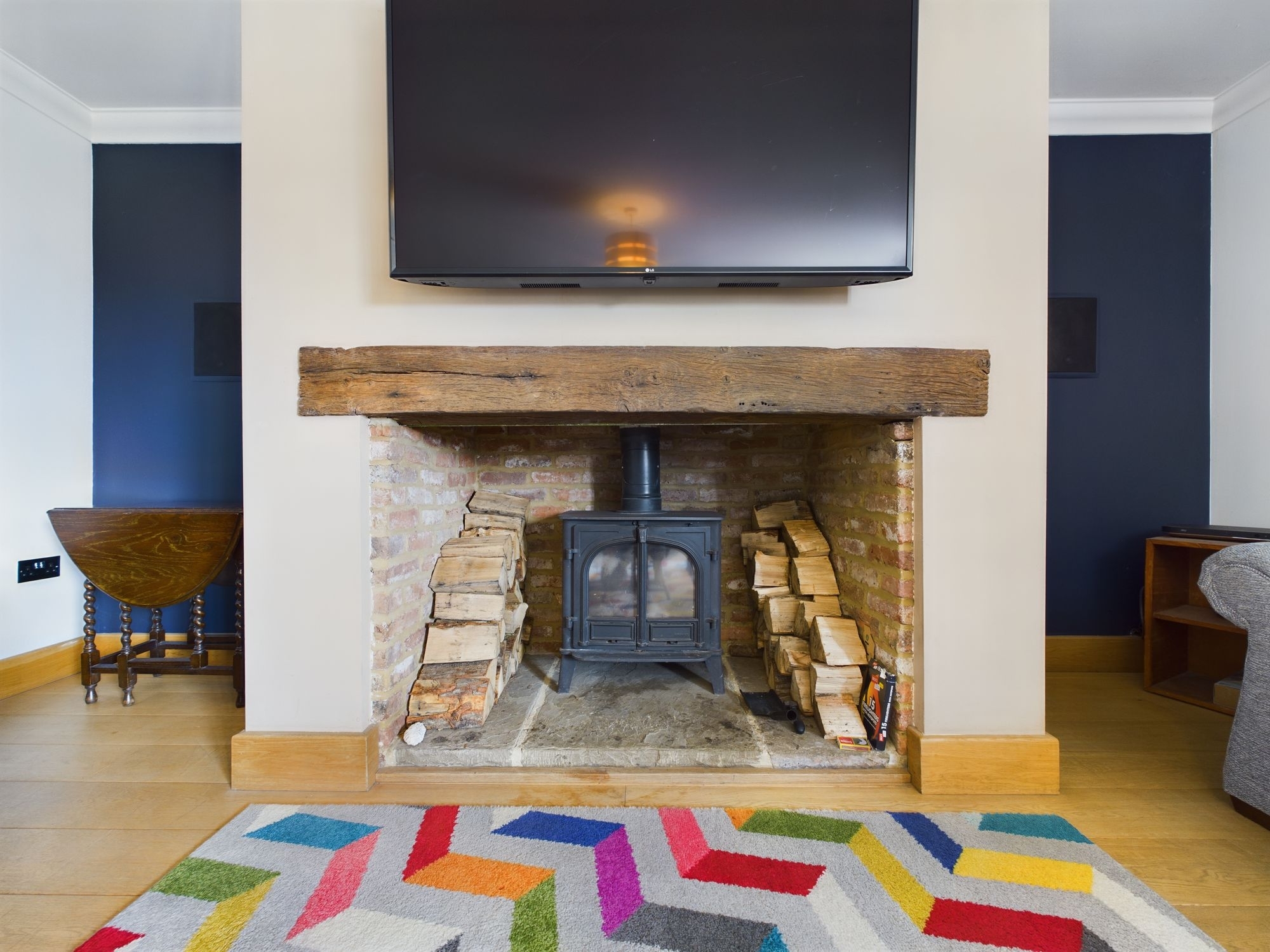 Triple glazed solid oak door with tilt windows to rear, central Inglenook fireplace with log burner inset and bressummer beam over, coved ceiling, oak flooring with under floor heating, surround sound system.
