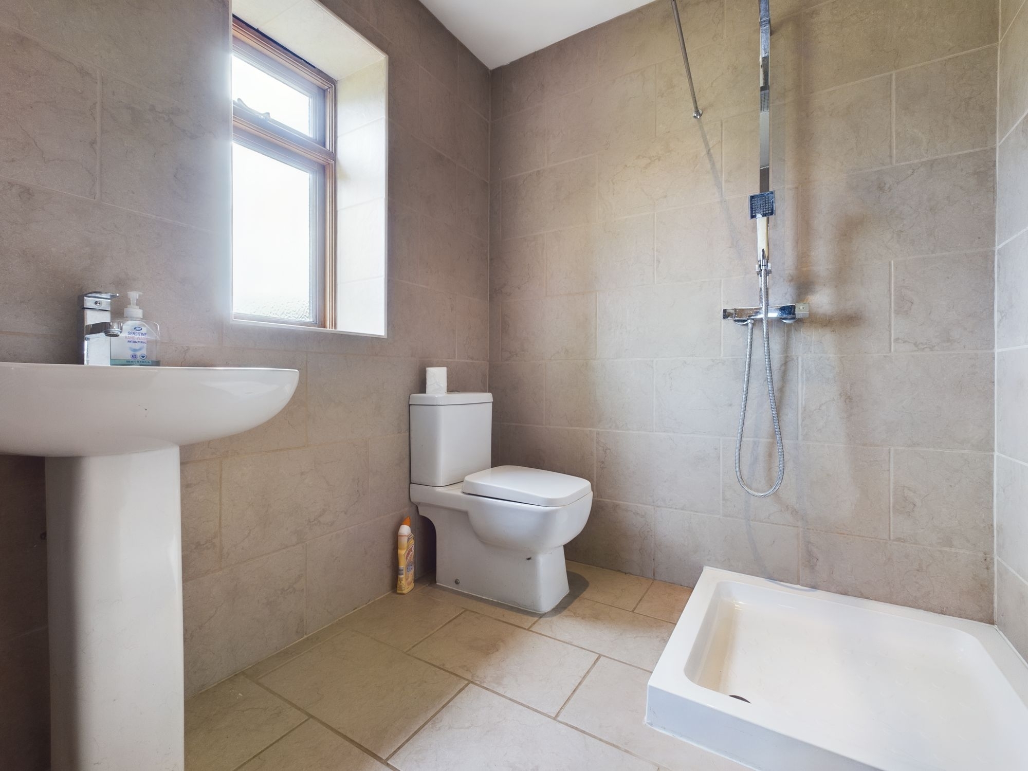 uPVC double glazed window to rear, corner shower cubicle, wall mounted heated towel rail, pedestal handwash basin, WC, fully tiled walls and flooring, ceiling spotlights, extractor.