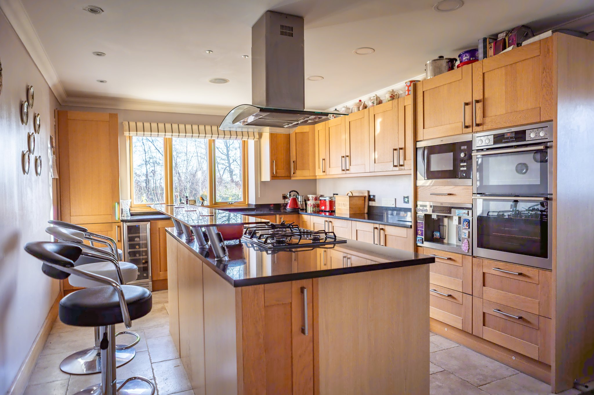 Triple glazed oak windows to rear, part glazed oak door to side, a range of wall and base units under granite worktops with stainless steel sink inset and mixer tap over, integral fridge/freezer, integral dishwasher, AEG eye level oven, AEG microwave, AEG ice and water cooler, water softener under sink, central island with breakfast bar and storage cupboards underneath, 5 ring LPG hob inset to further granite worktops with stainless steel extractor over, integral drinks refrigerator, coved ceiling with spotlights inset, Quarry tiled flooring with under floor heating, opening to:-