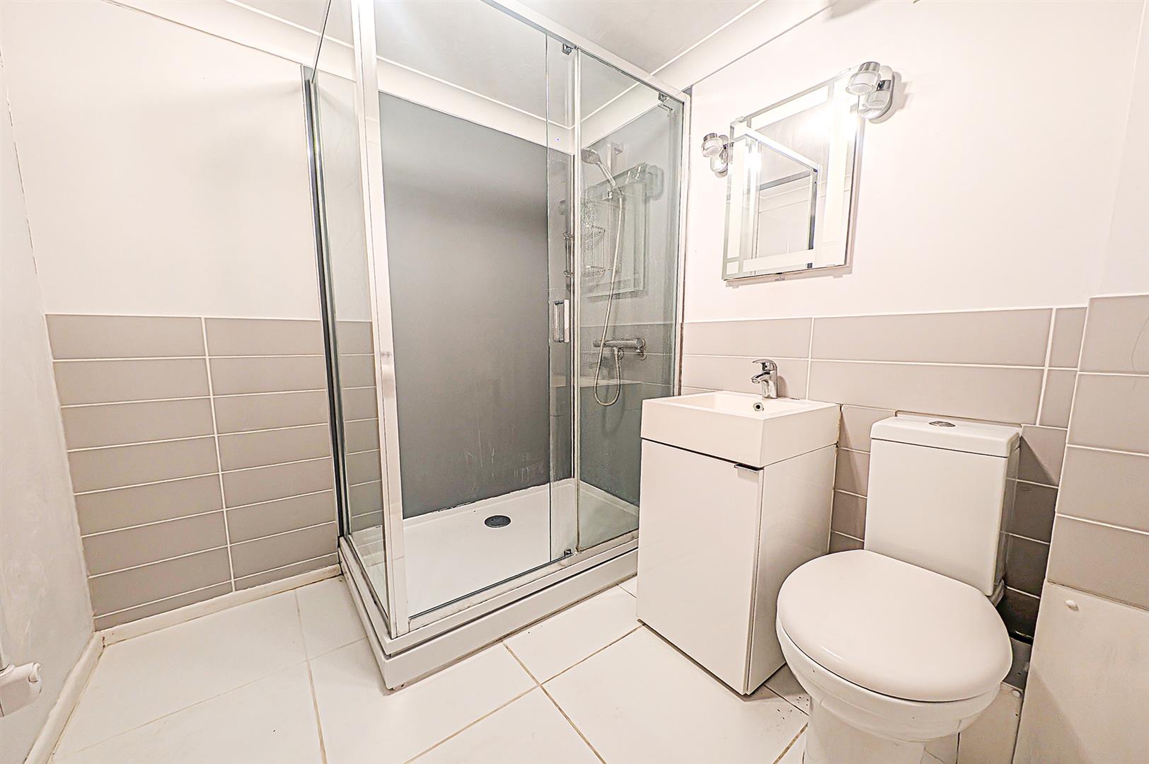 Modern three piece bathroom suite comprising a low level WC, hand basin with vanity cupboard under, walk-in shower cubicle, part tiled walls, tiled flooring and heated towel rail.