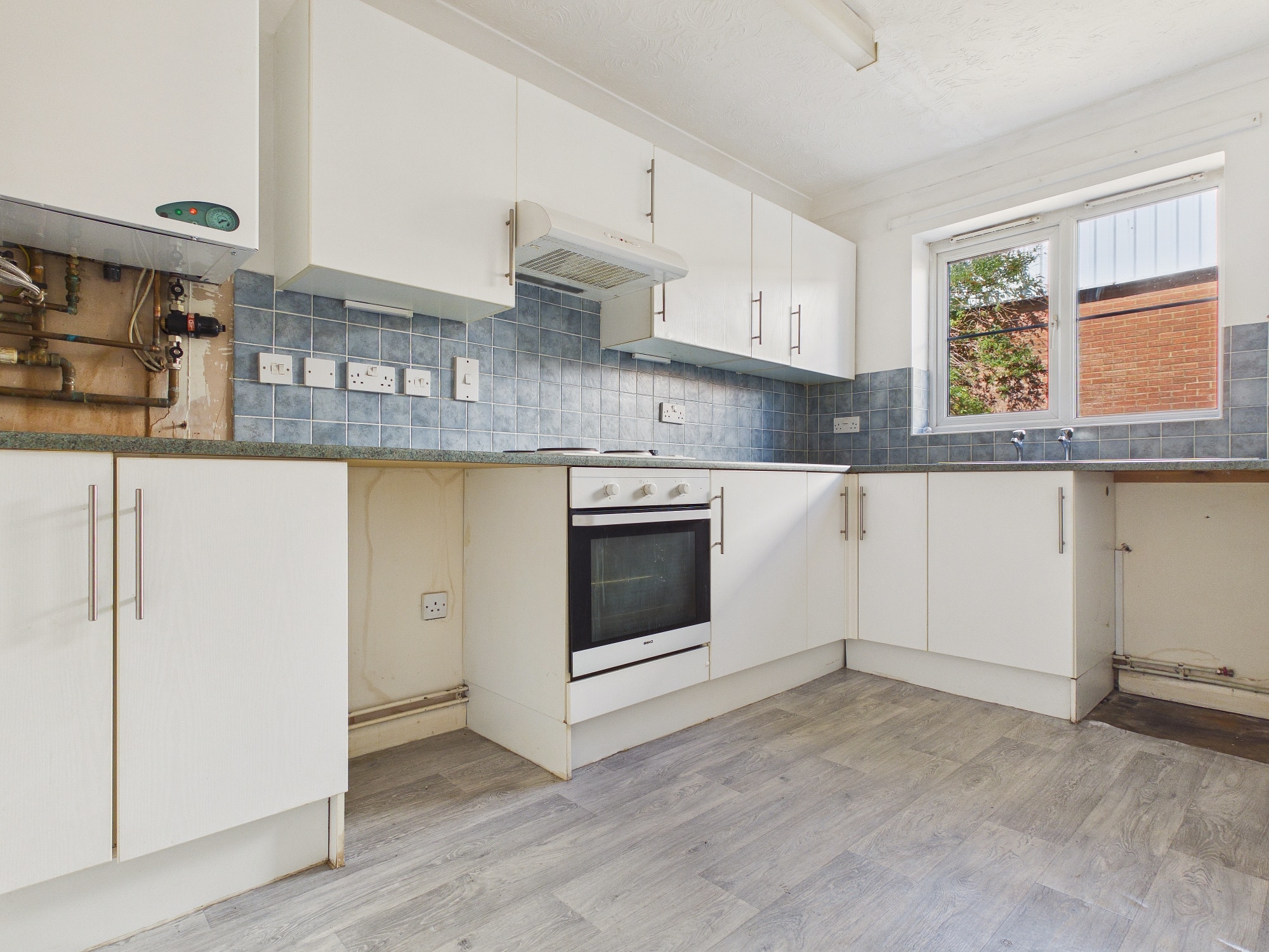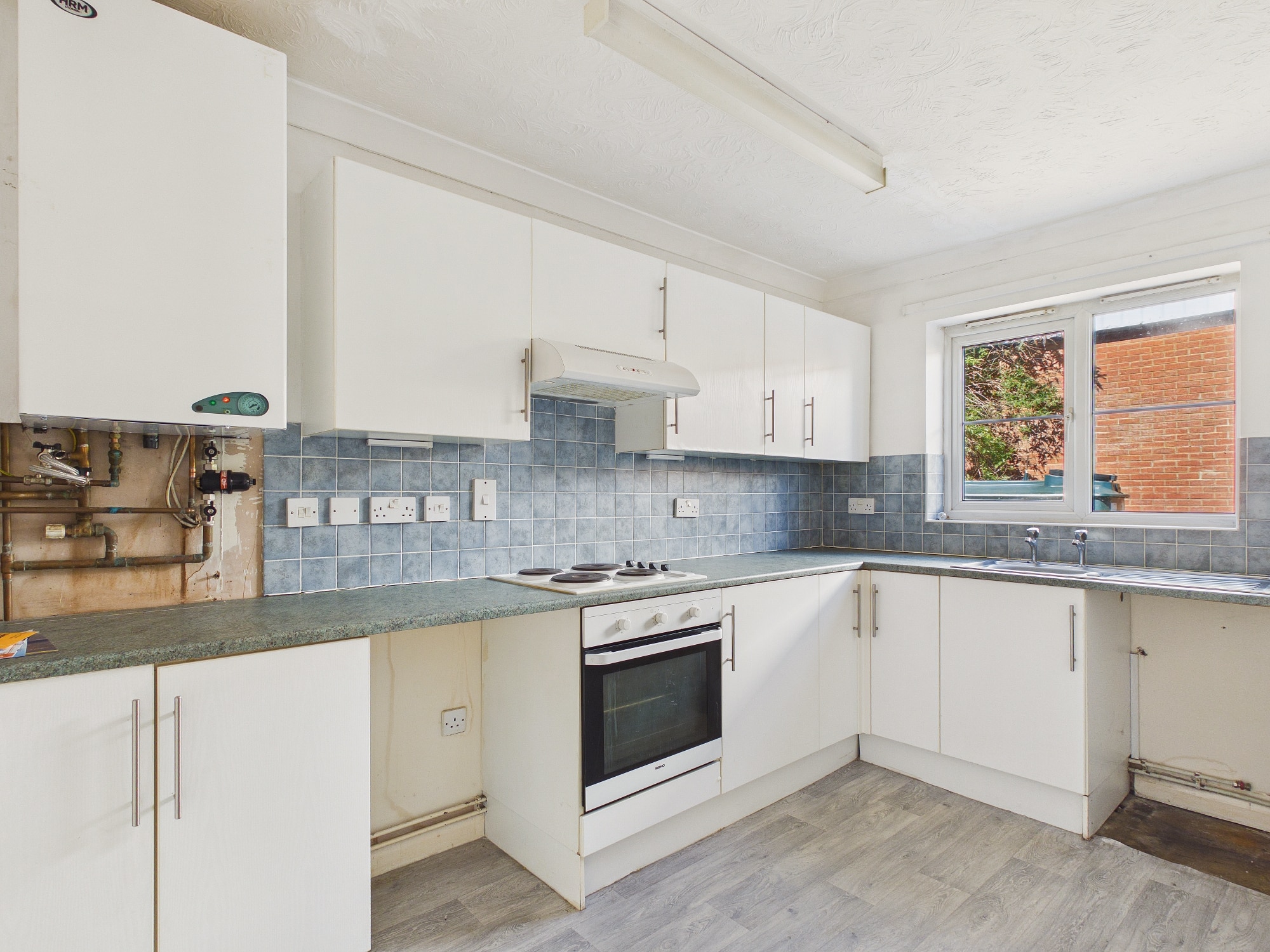 uPVC double glazed window to rear, wall mounted double panel radiator, wall mounted oil central heating boiler, a range of wall and base units under round edge worktops, stainless steel sink drainer inset, 4 ring electric hob inset with oven under and extractor over, space for washing machine and tumble drier, space for fridge/freezer, lino style flooring, textured and coved ceiling.