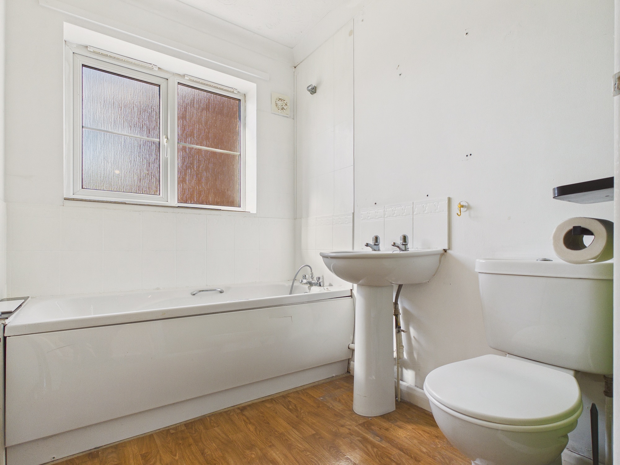 uPVC double glazed window to side, wall mounted single panel radiator, panelled bath with mixer tap and shower head over, pedestal hand wash basin, WC, extractor, lino style flooring, textured and coved ceiling.