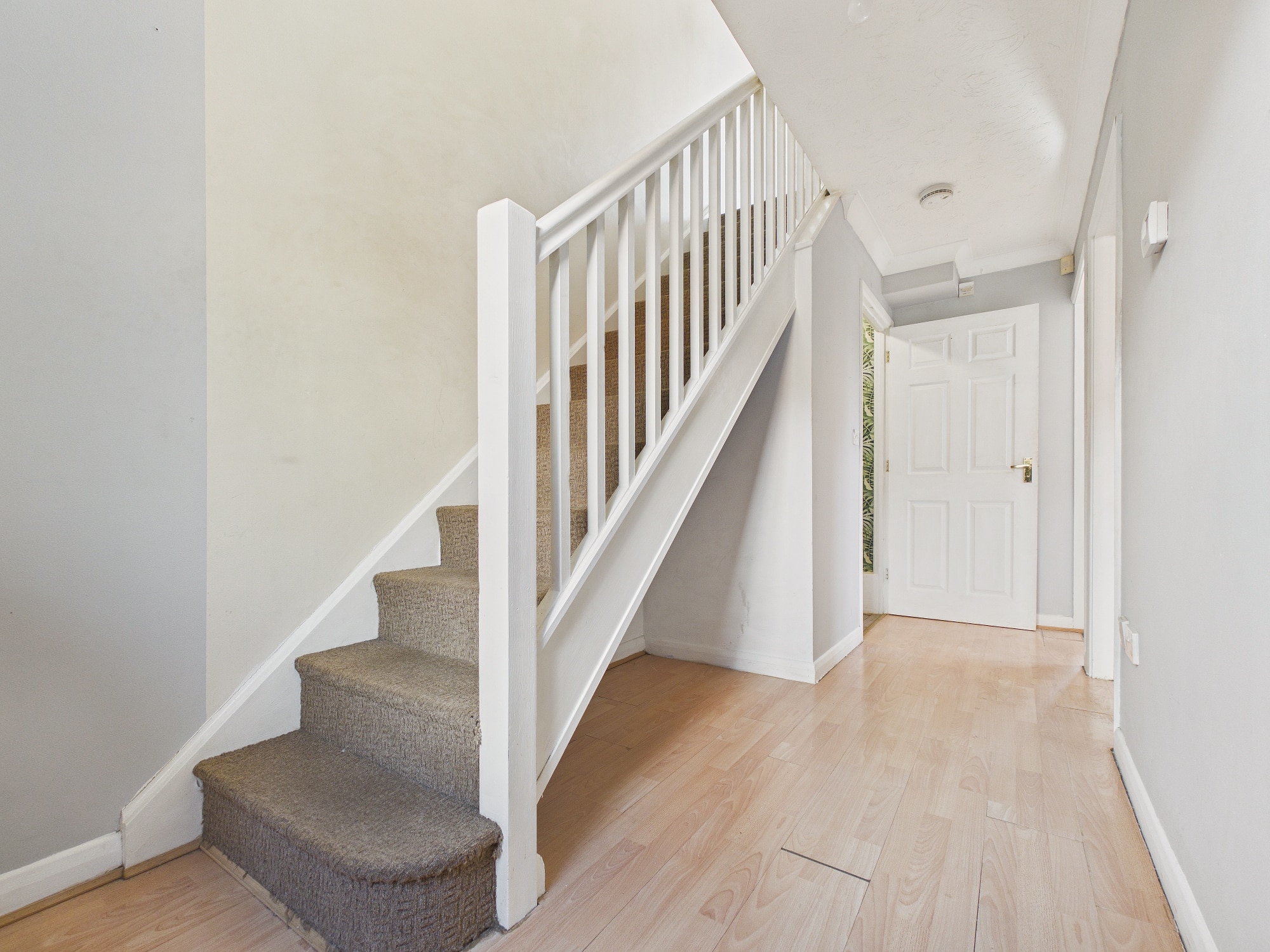 Wall mounted double panel radiator, uPVC part glazed door to rear, stairs to first floor, laminate style flooring, textured and coved ceiling, door to kitchen, door to:-