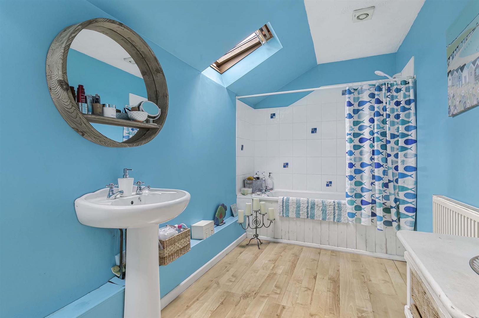 White suite comprising low level WC, pedestal hand basin and panelled bath with shower over. Two Velux windows and radiator.