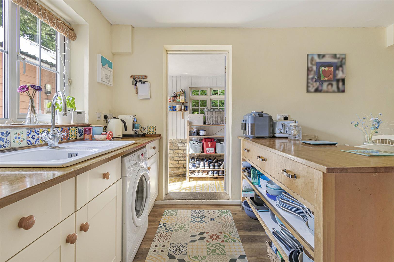 Fitted with a range of base level storage units with wooden worktop surfaces, ceramic sink and drainer with mixer tap, space for electric oven, space and plumbing for washing machine. Window to rear aspect, with doors leading to hall way and: