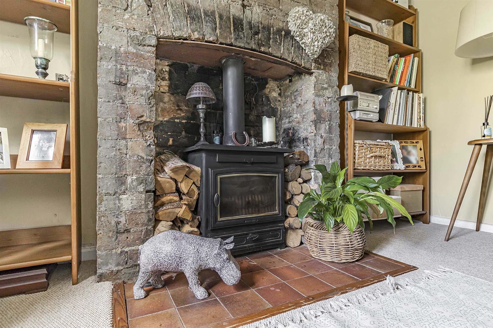 Staircase rising to first floor, fitted storage cupboard, fitted log burner, radiator and two windows to front aspect.