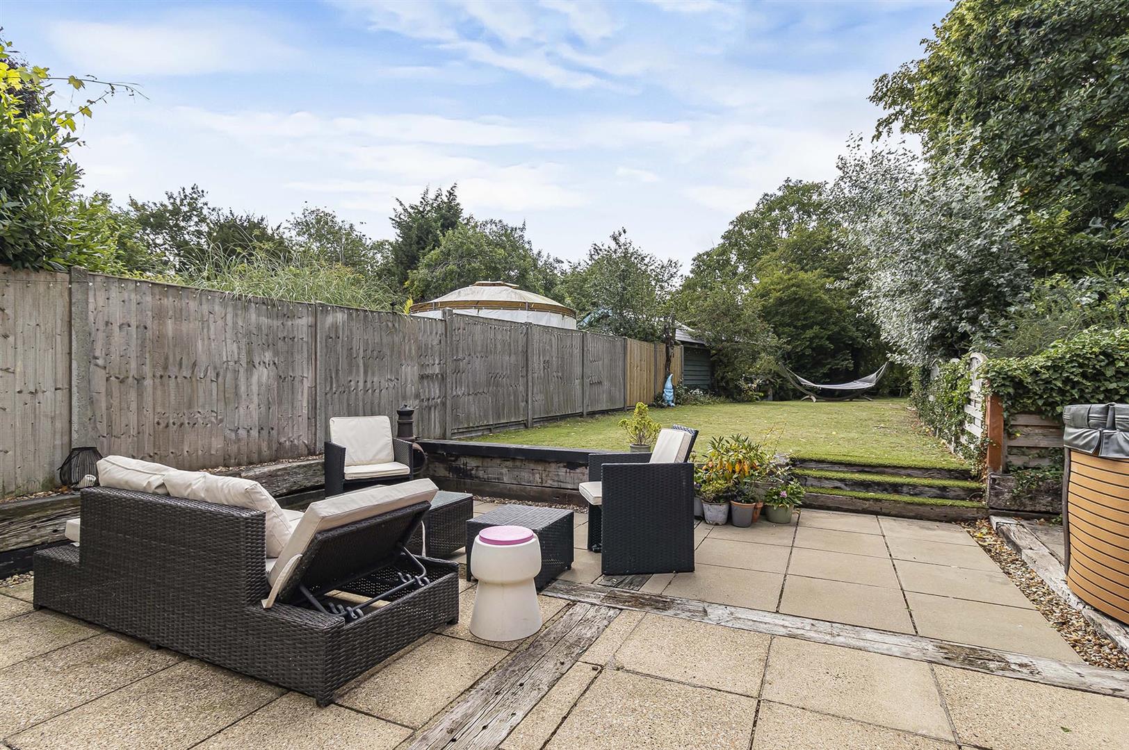 Outstanding long and mature gardens with patio seating area and French doors leading to Family room.