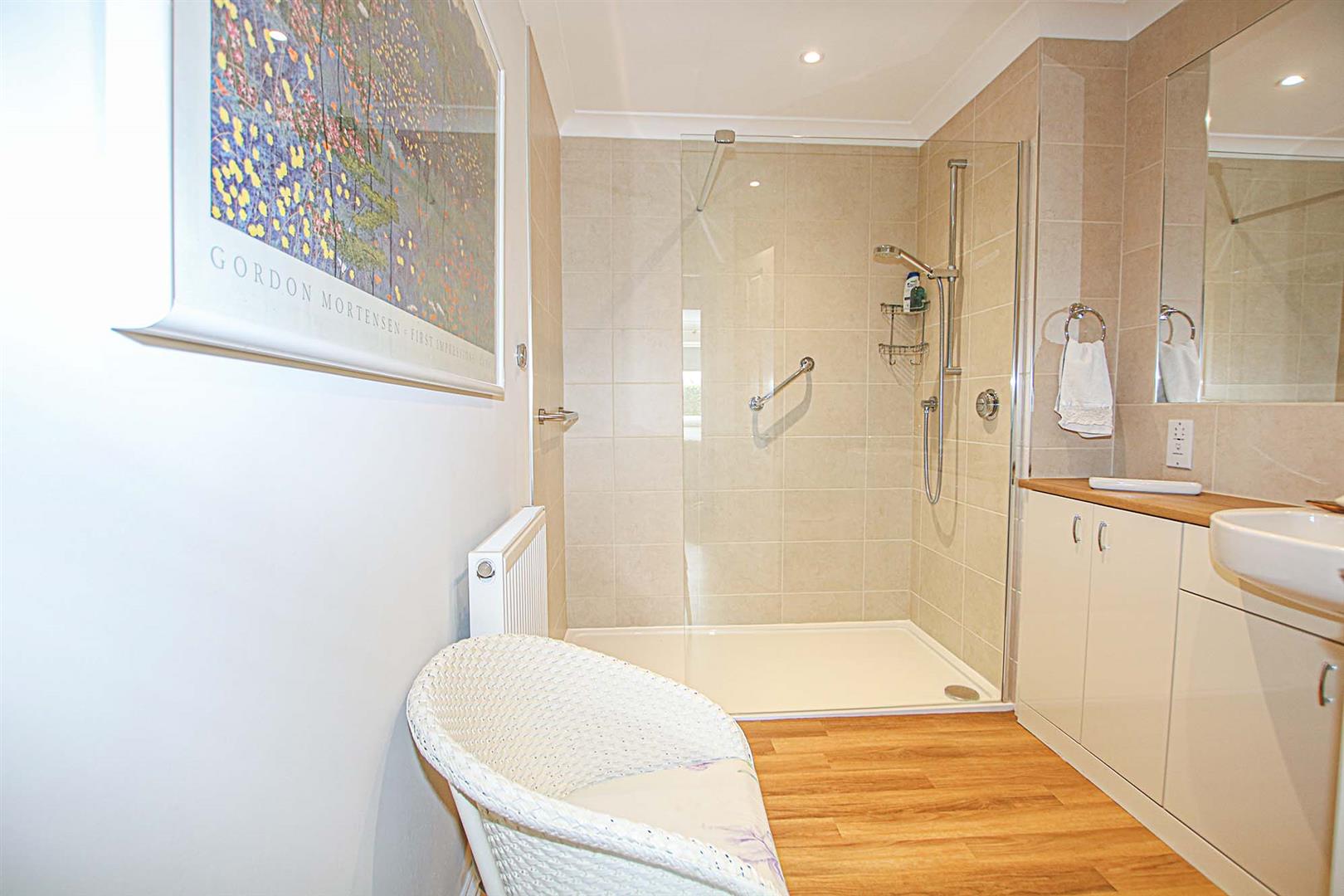 Three piece suite comprising low level WC with concealed cistern, sink with vanity unit, shower cubicle. Base level cupboards. Radiator.
