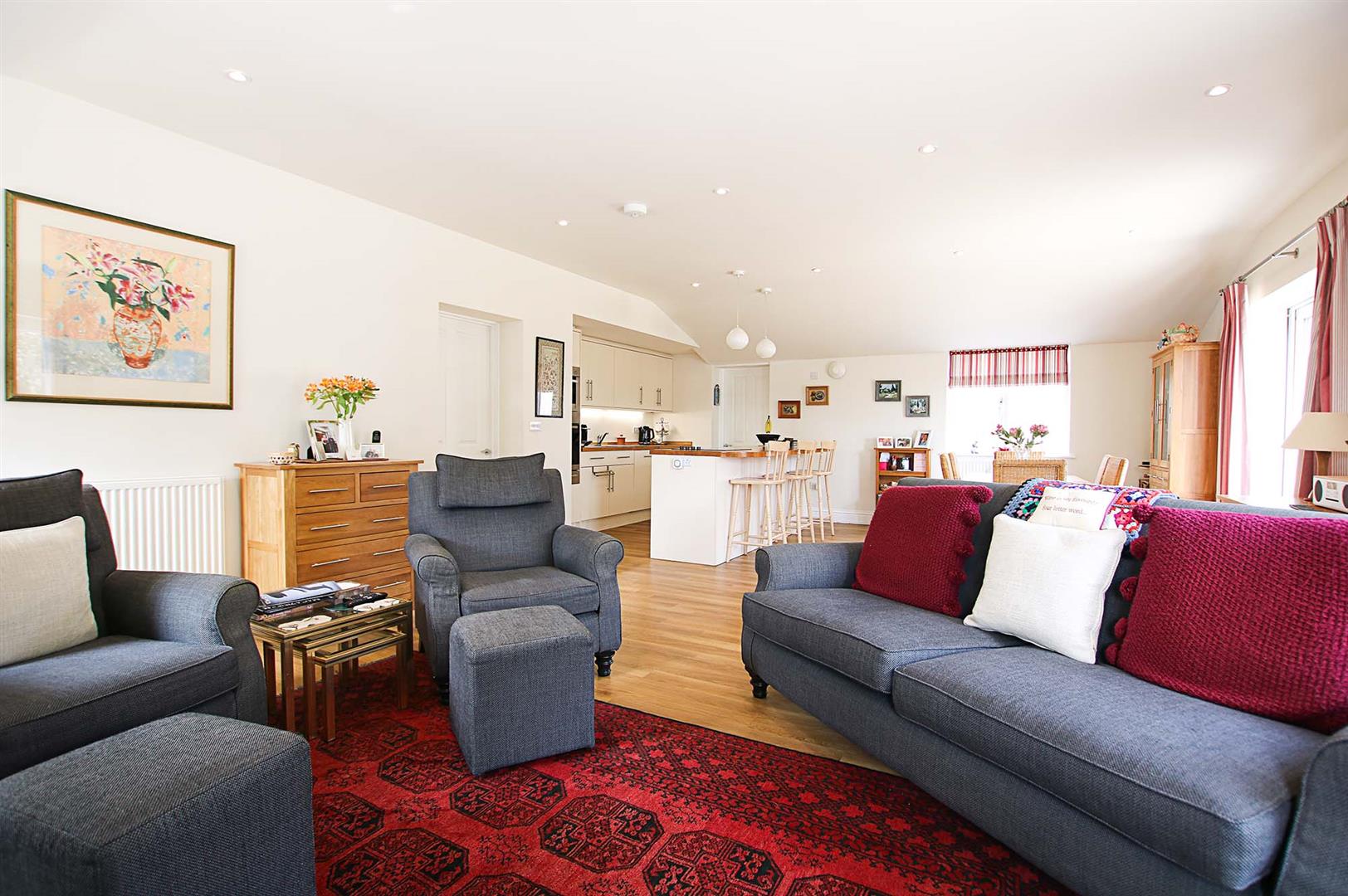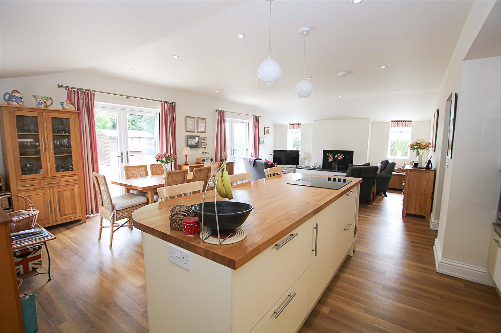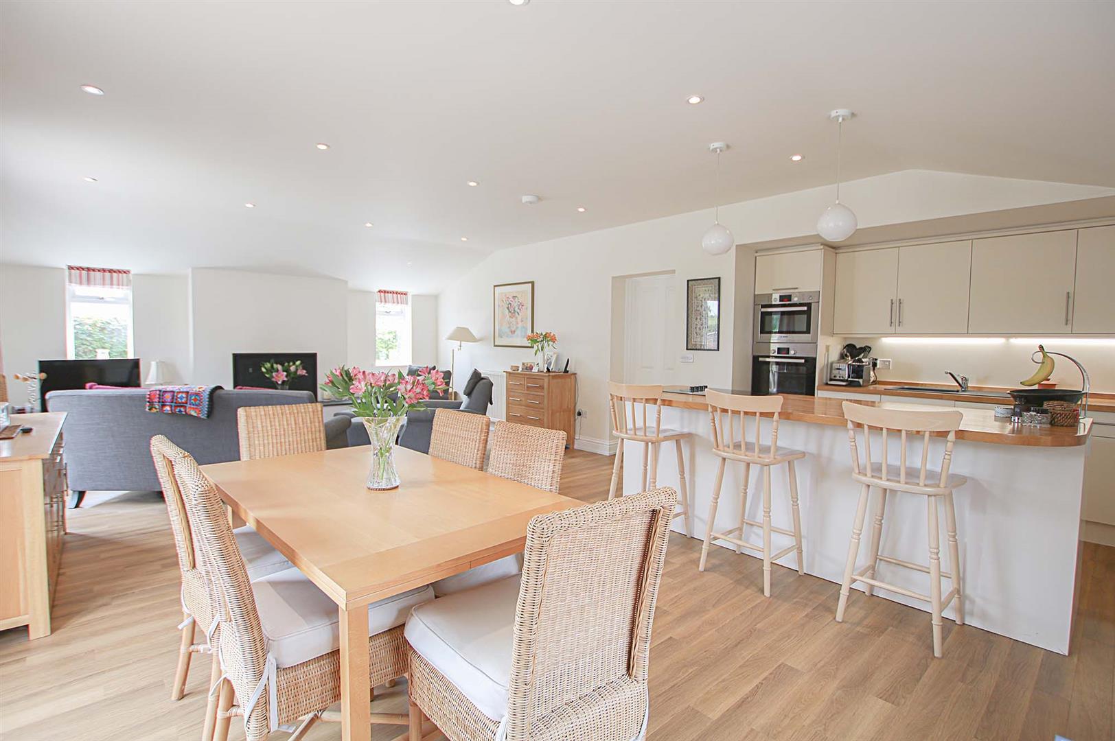 Kitchen Area- Fitted with a range of matching eye and base level storage cupboards with wooden working surfaces over. Sink and drainer with mixer tap over. Intergrated oven. Intergrated dishwasher. Intergrated fridge. Large work surface with intergrated electric hob and space for stools.