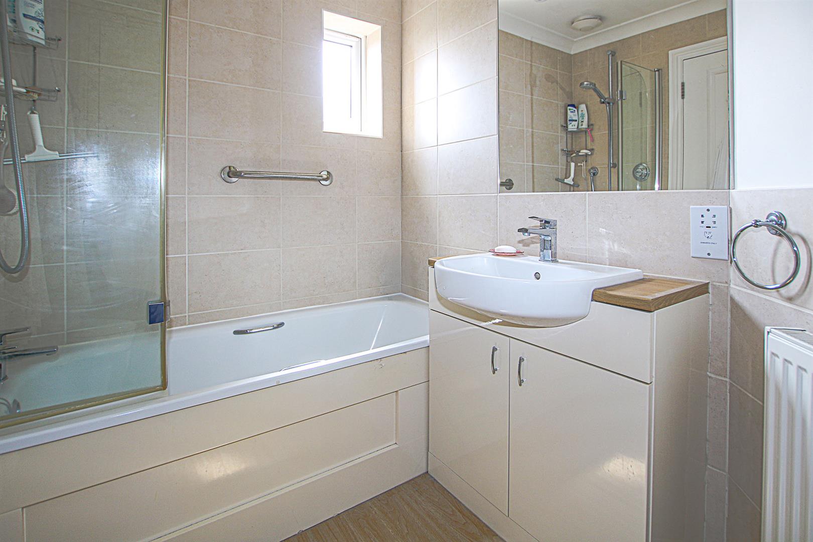 Three piece suite comprising low level WC with concealed cistern, sink with vanity unit, panelled bath with shower over. Built in storage cupboard. Obscured window to side aspect. Radiator.