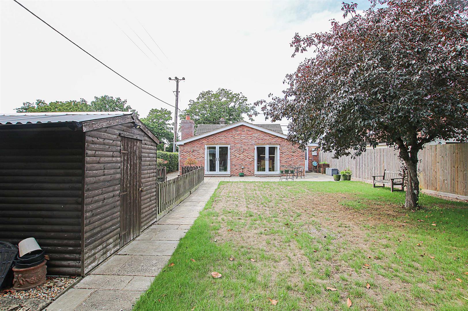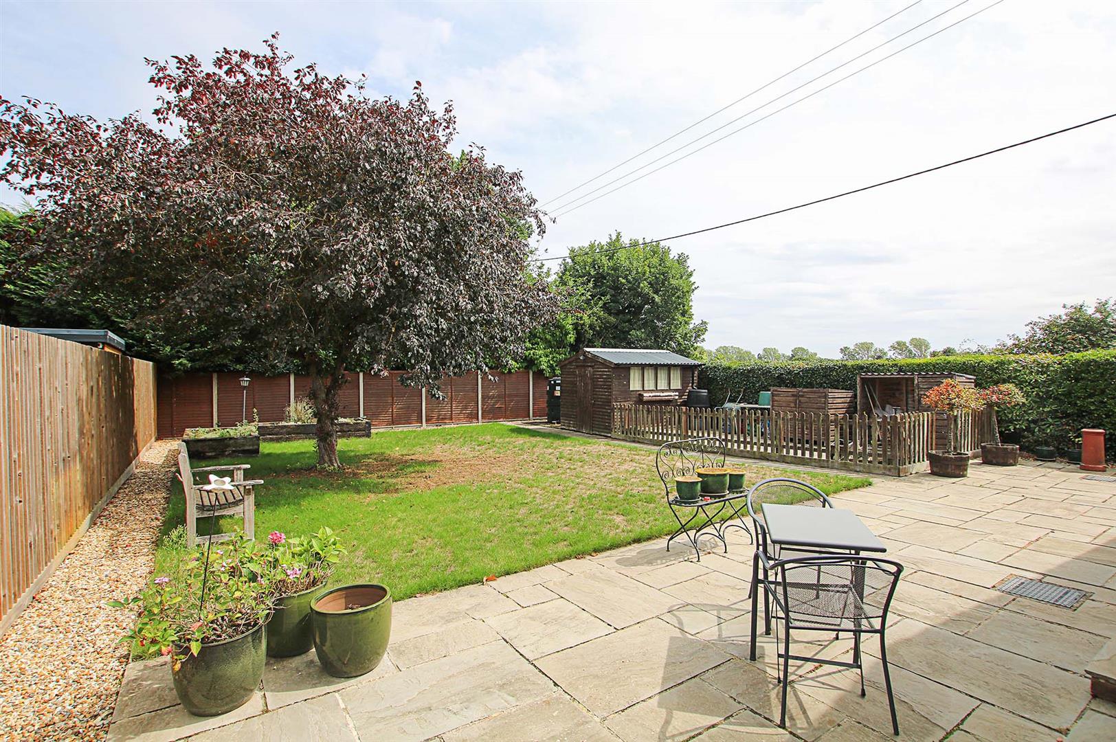 Fully enclosed rear garden with large patio area, raised beds, lawned area bordered by gravel pathway. Fenced area housing garden equipment and large shed. Oil tank. Gated access to front garden and door to garage.