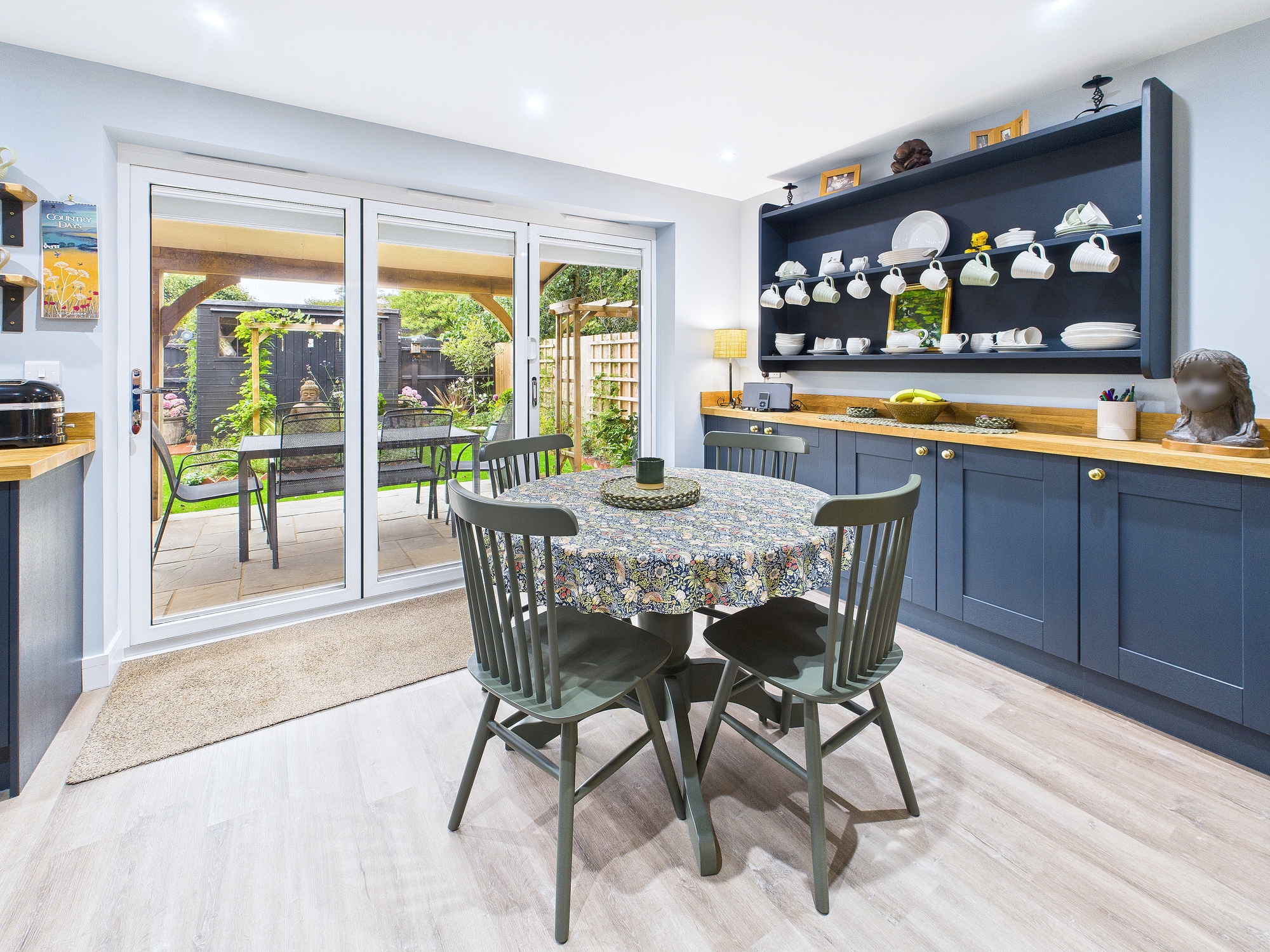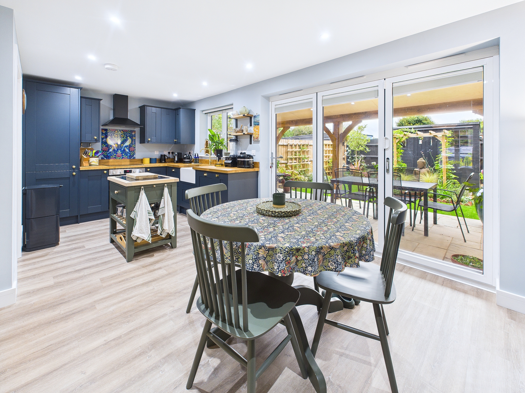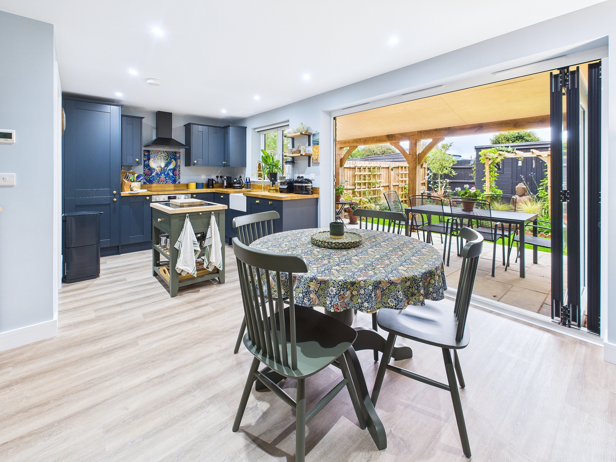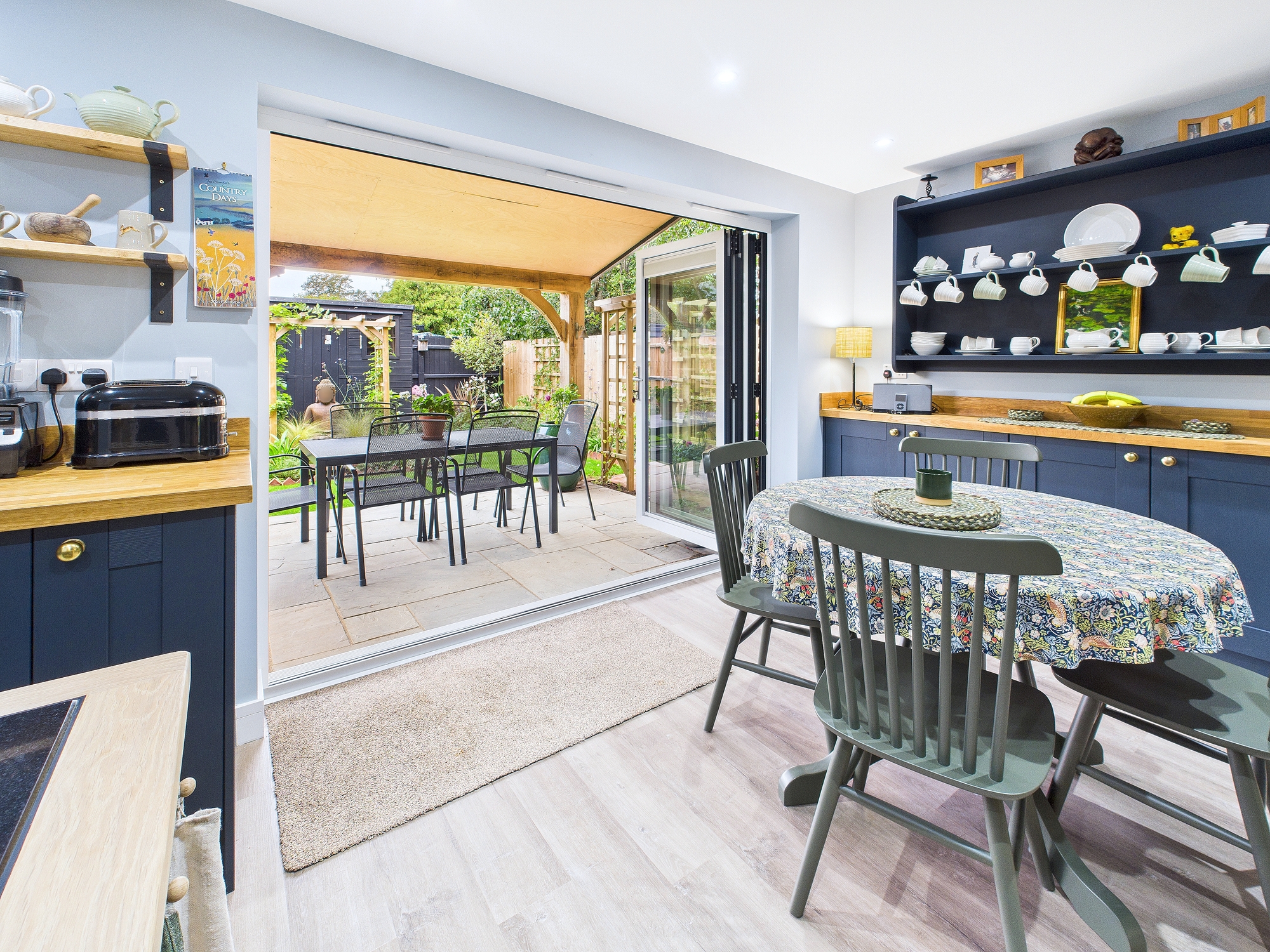 Bi-fold doors into rear garden, base units matching the kitchen.