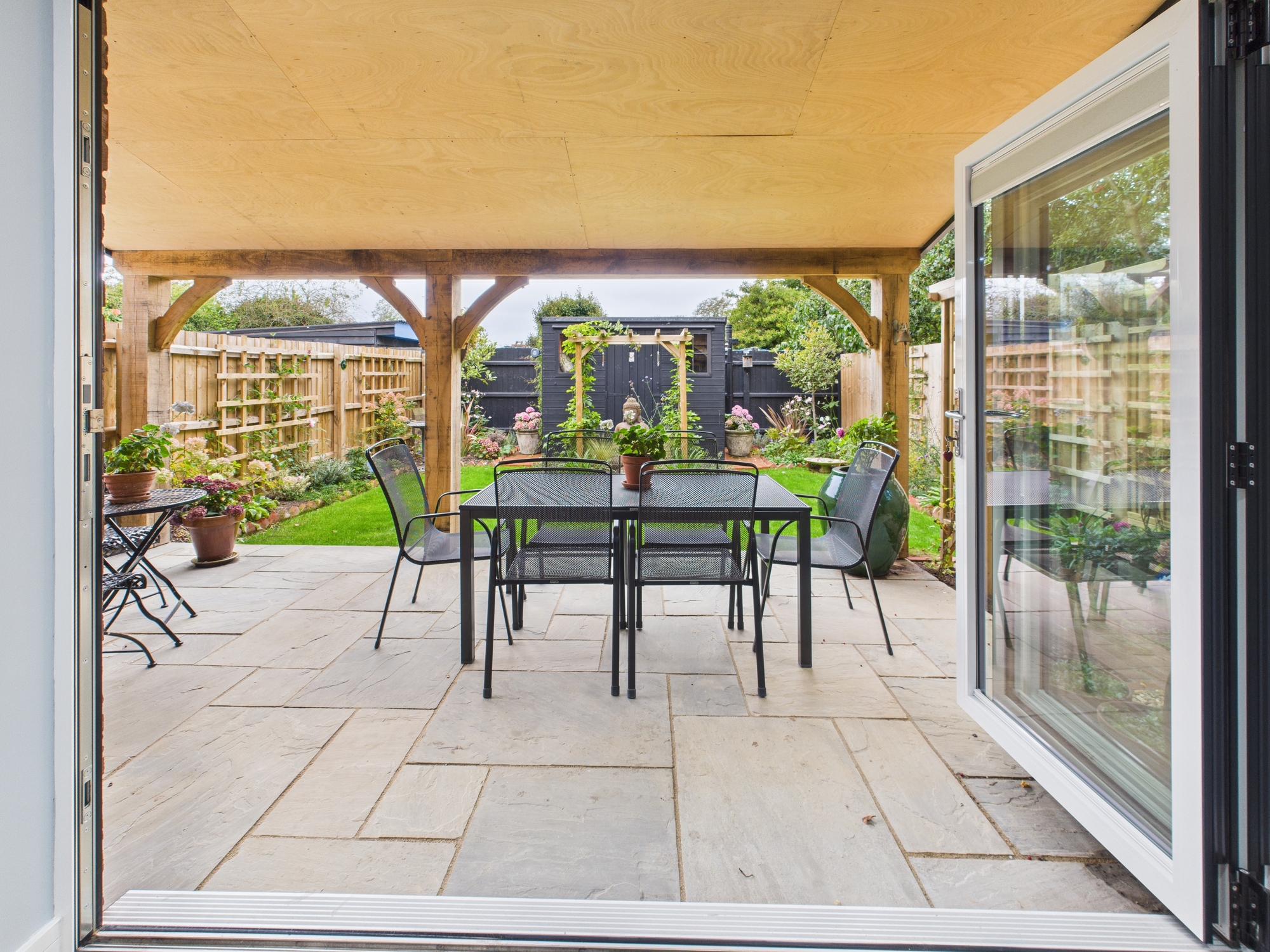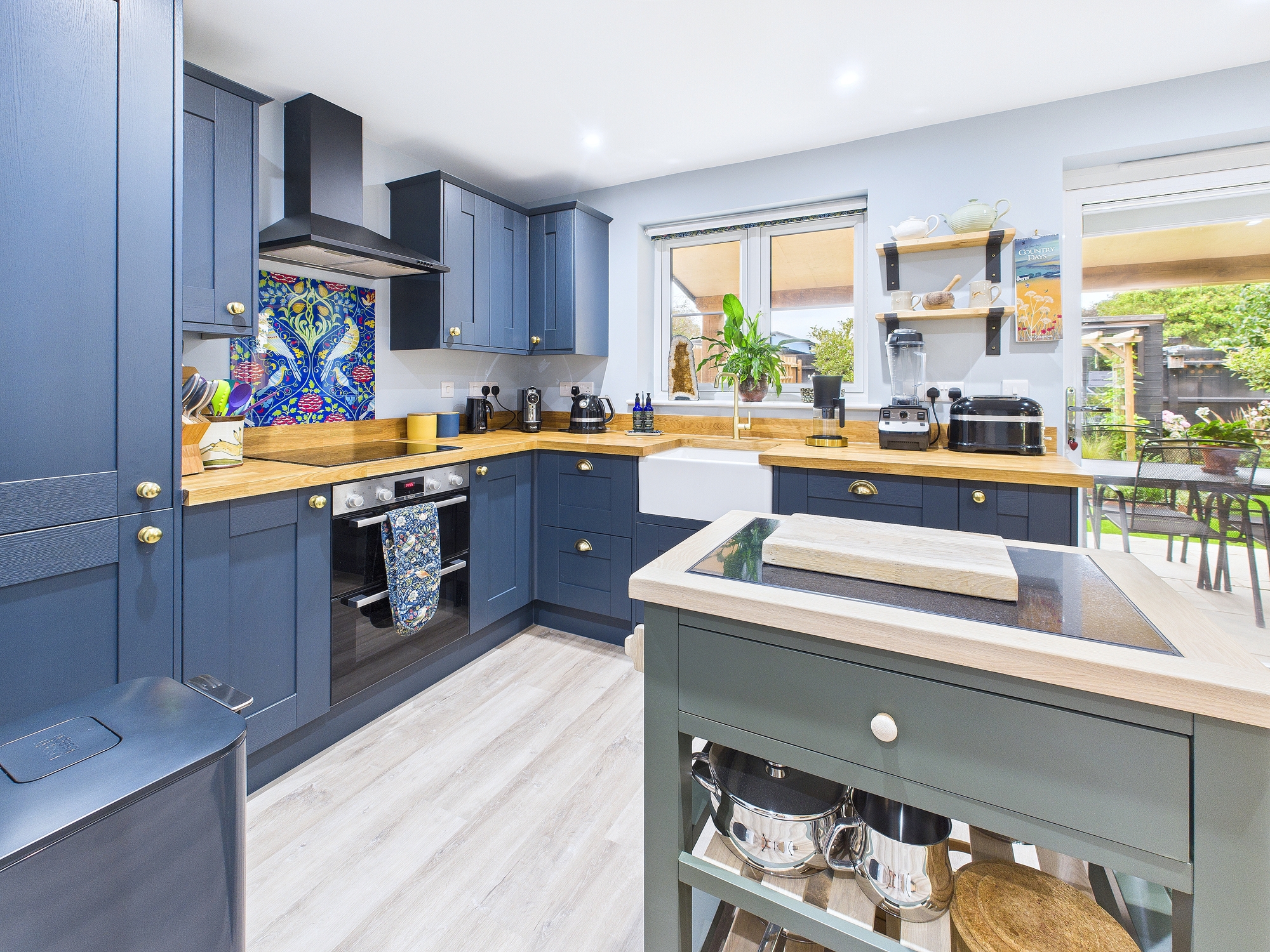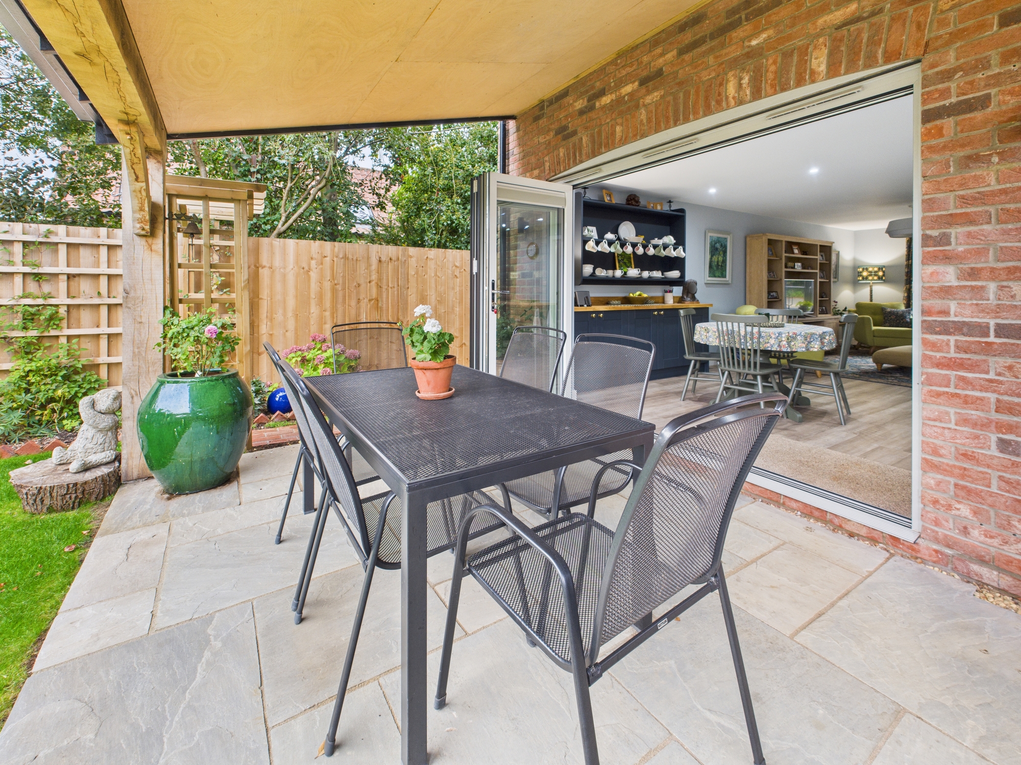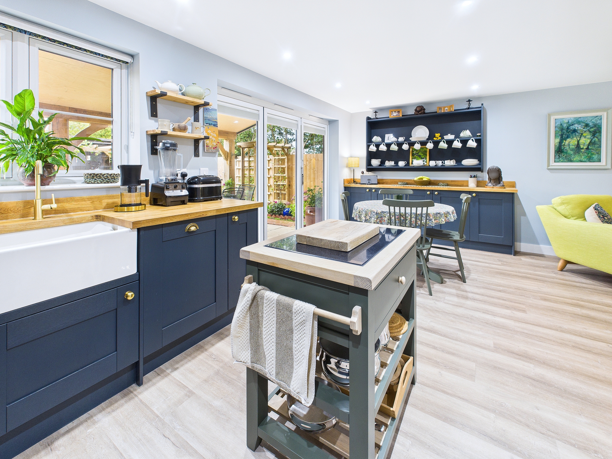 Bi-fold doors into rear garden, base units matching the kitchen.