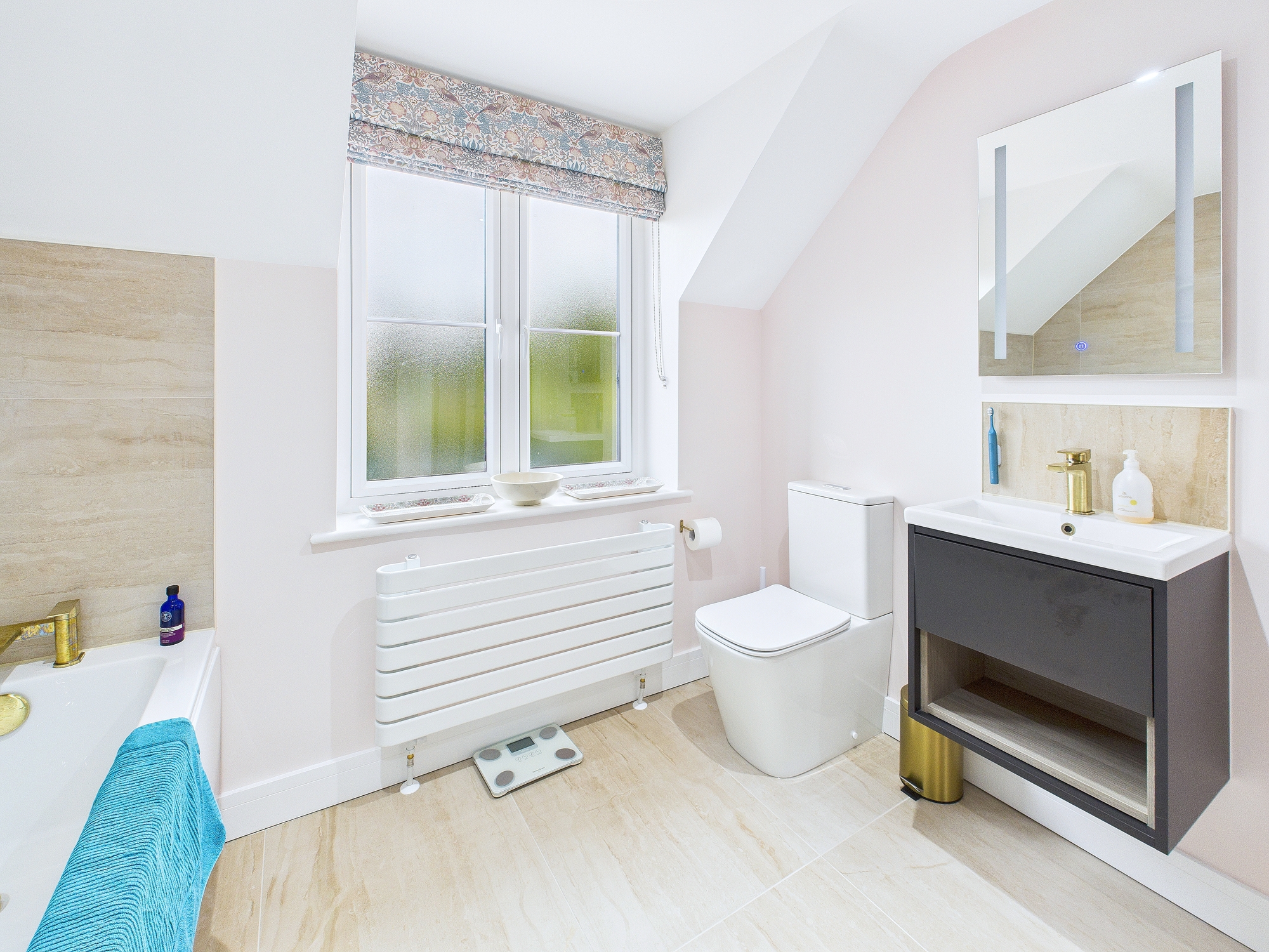 Walk in shower cubicle, bath, low level w.c., handwash basin inset to floating vanity unit, wall mounted mirror, extractor fan, towel radiator.