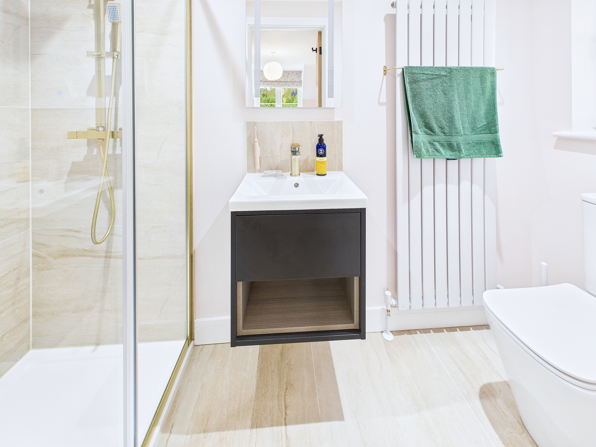 Shower cubicle, low level w.c., handwash basin inset to floating vanity unit, extractor fan, wall mounted towel radiator.