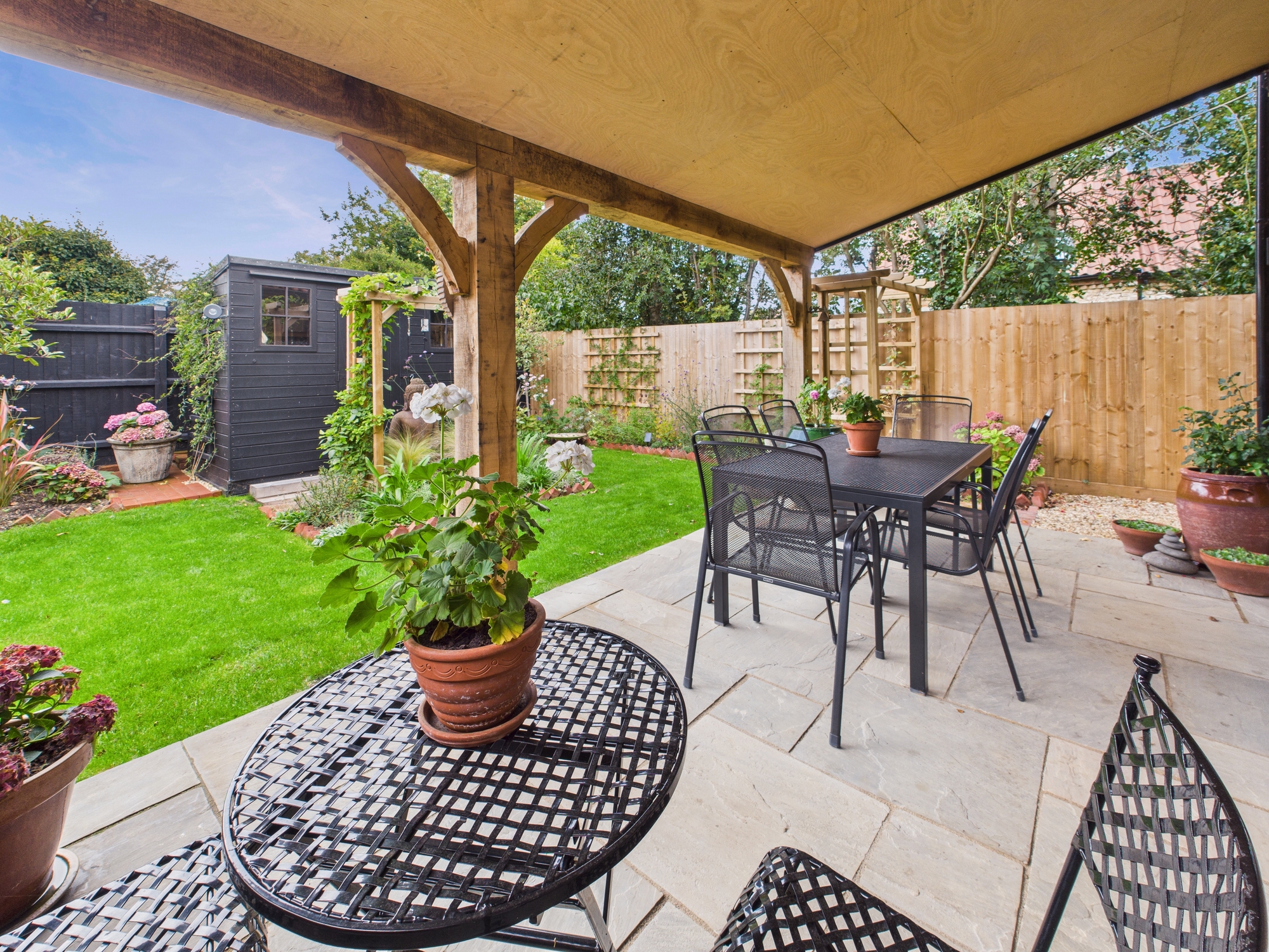 To the front of the property there is a gravel area for ample off road parking leading to the porch and entrance door. To the rear there is a solid wooden stretched canopy with tiled roof, there is also an outside tap and timber shed. The remainder of the rear garden is mainly laid to lawn with shrubs and flowered borders, gate to front and electric points.