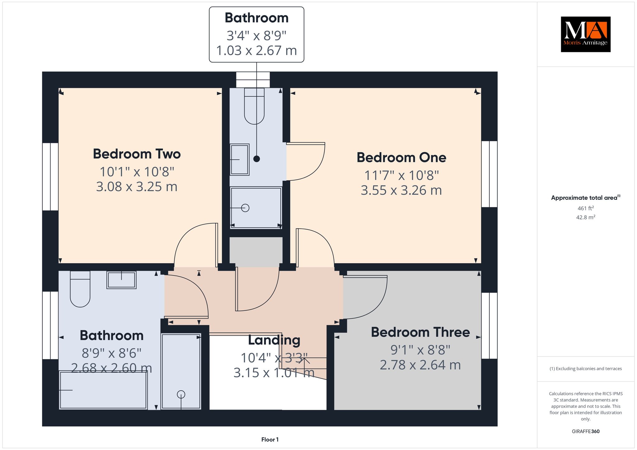 Bedroom One 11’7” x 10’8” (3.55m x 3.26m)
