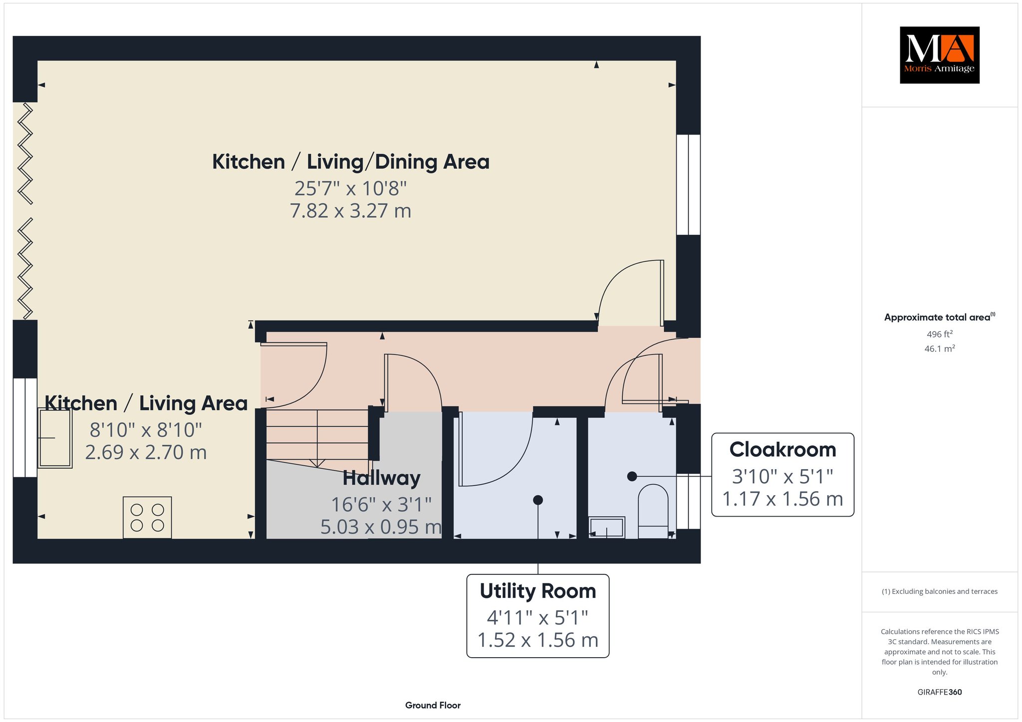 Open Plan Kitchen/Living/ Dining Room 25’7” x 10’8” (7.82m x 3.27m)