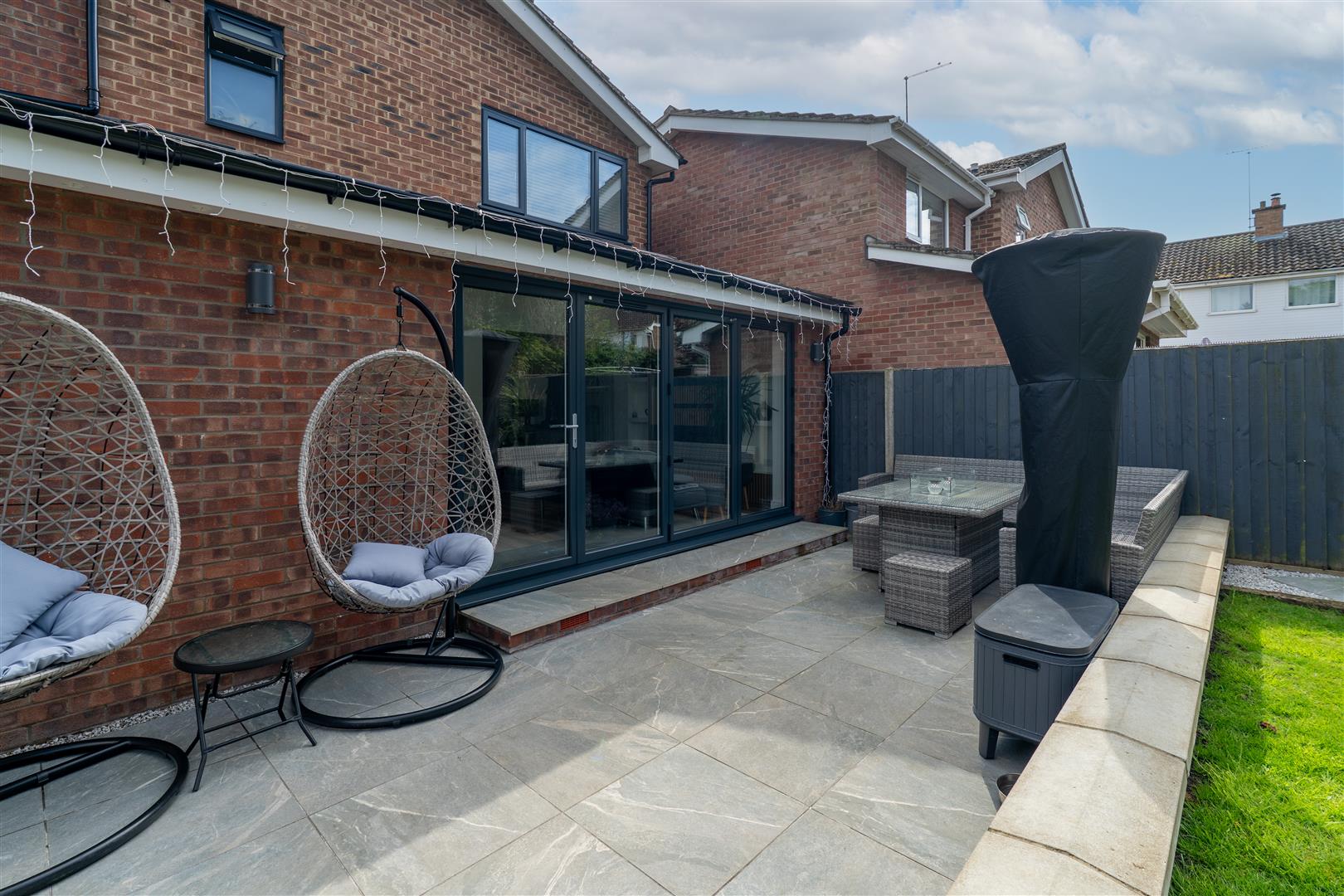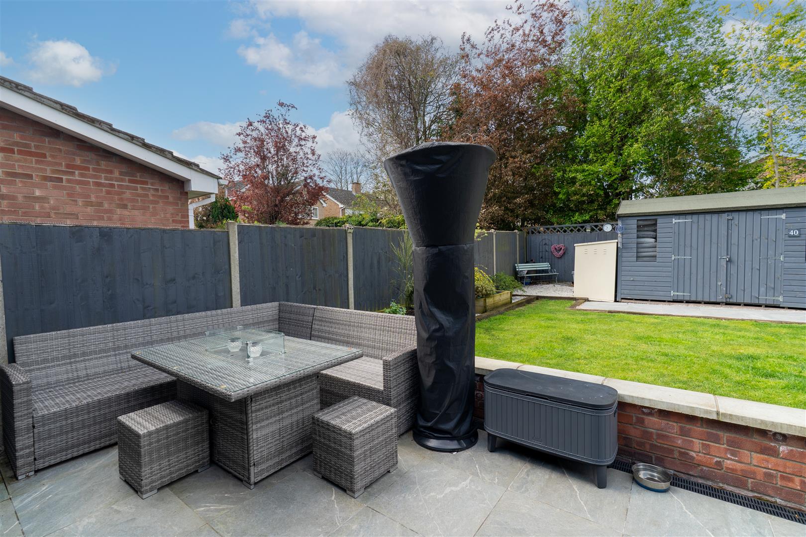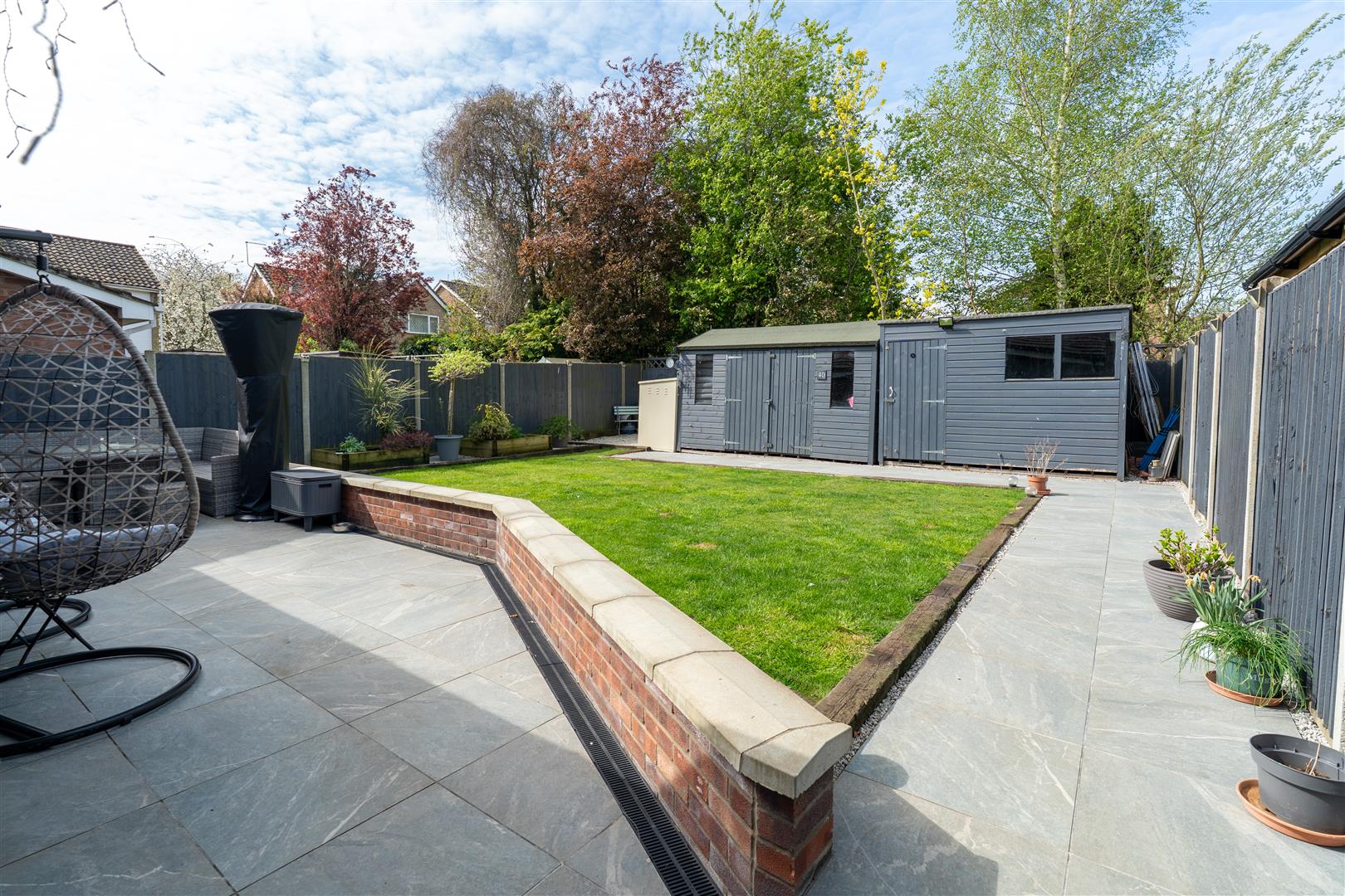 Flagstone patio area, with bi-folding doors leading to kitchen/lounge. Side pathway leading to rear timber sheds. Central lawned area with gravel boarder with raised planted beds. Further gravelled seating area to rear. Access gate to front.