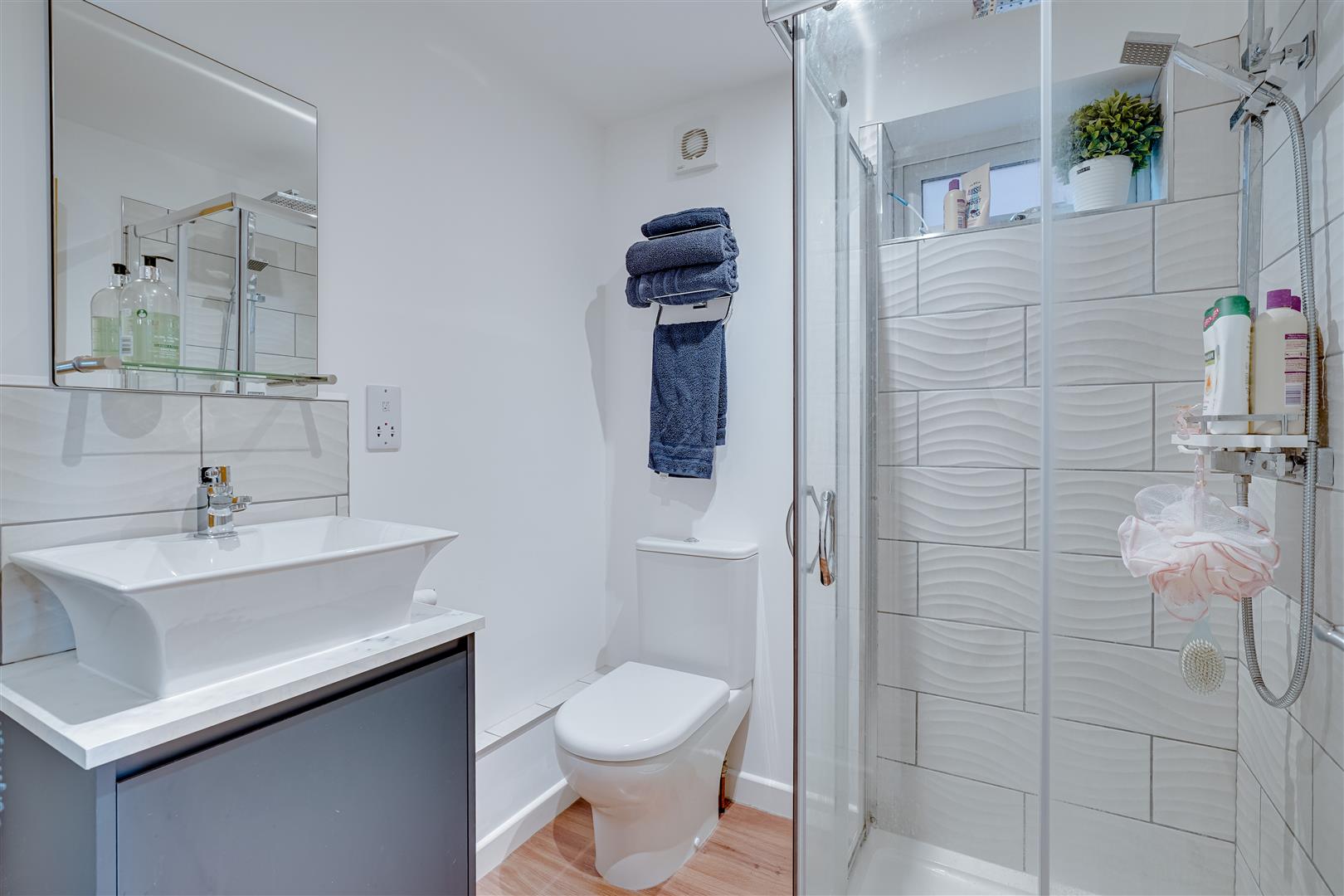 Contemporary white suite comprising low level W.C., ovel counter top hand basin with mixer tap over and storage cabinet under and walk-in shower. Built-in storage cupboard. Attractively tiled to wet areas. Wooden flooring. Ladder radiator. Door to Master bedroom.