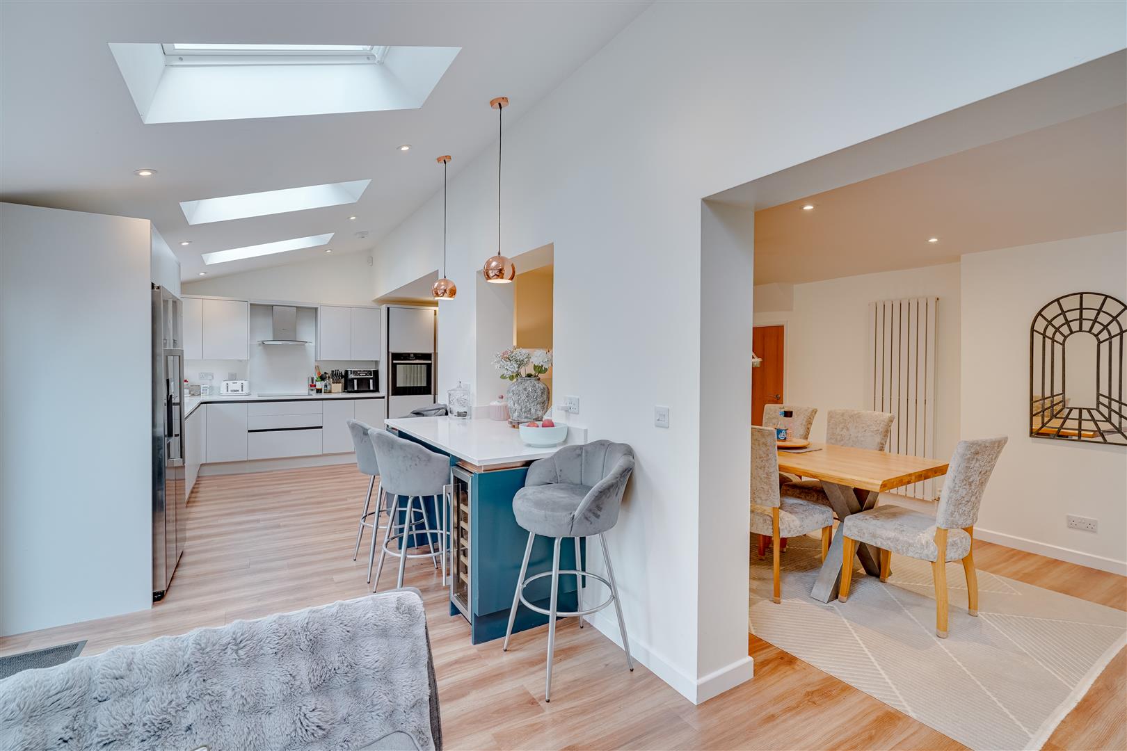 Contemporary kitchen/diner with a range of matching eye and base level cupboards with composite worktop over. Further breakfast seating area with composite counter top and integrated wine cooler. Inset double sink with mixer tap over. Integrate, eye level ovens. Inset induction hob with stainless steel and glass extractor above. Integrated dishwasher. Inset space for American style fridge/freezer. Wooden flooring. Velux window. Window to rear aspect. Opening to dining room.